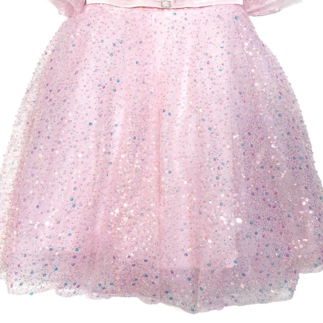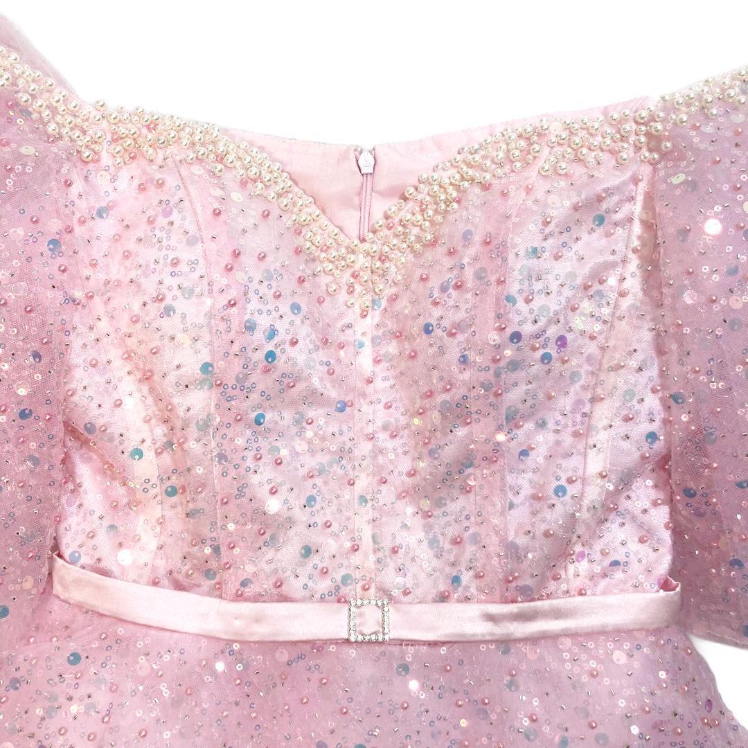全体に散りばめられたスパンコールが光を反射してきらめく、華やかなピンクのミニドレスです。