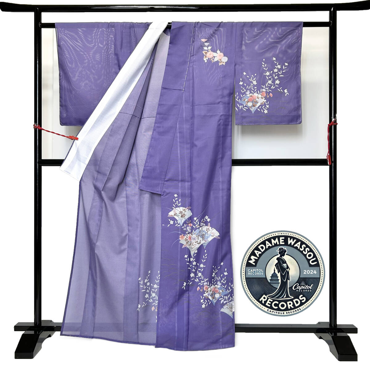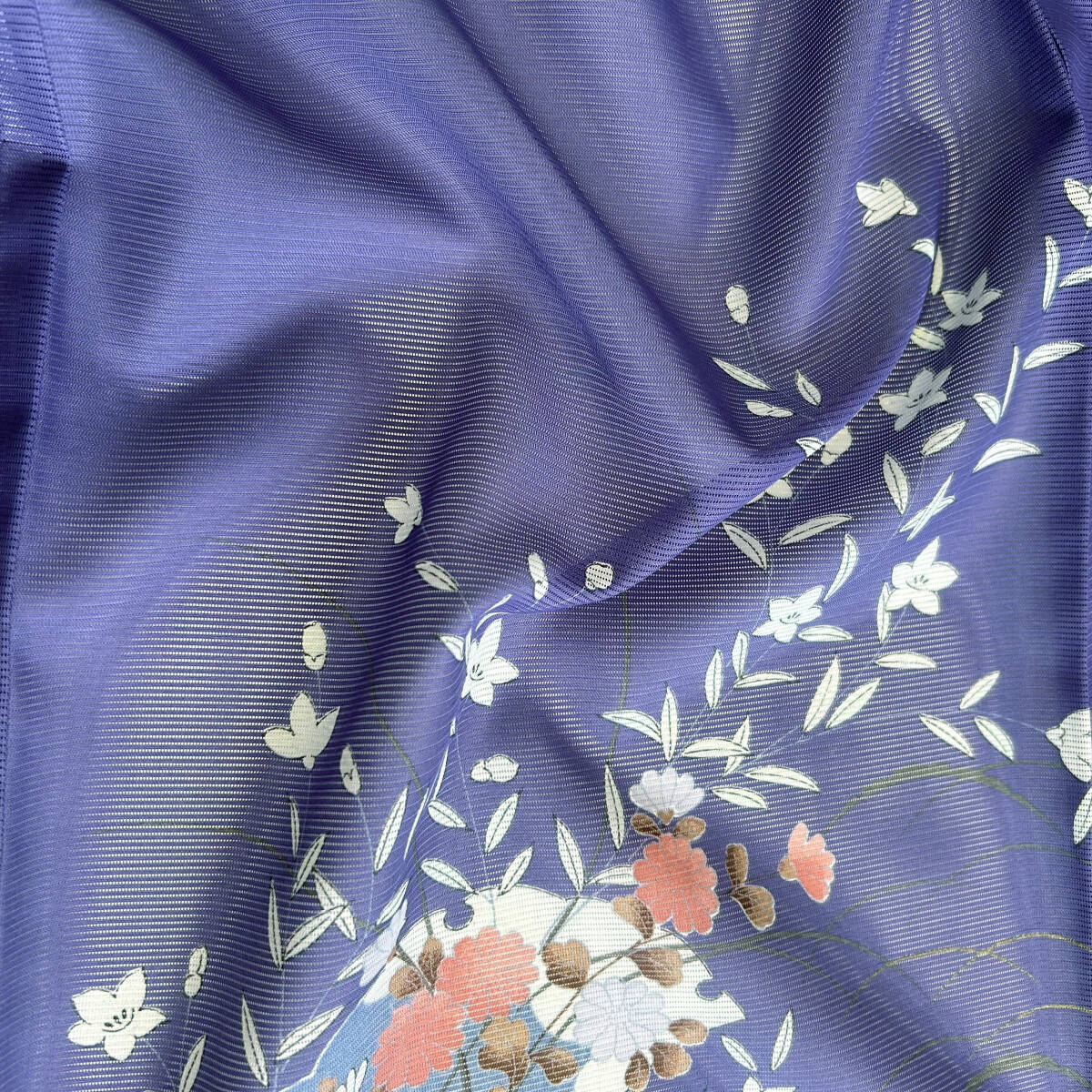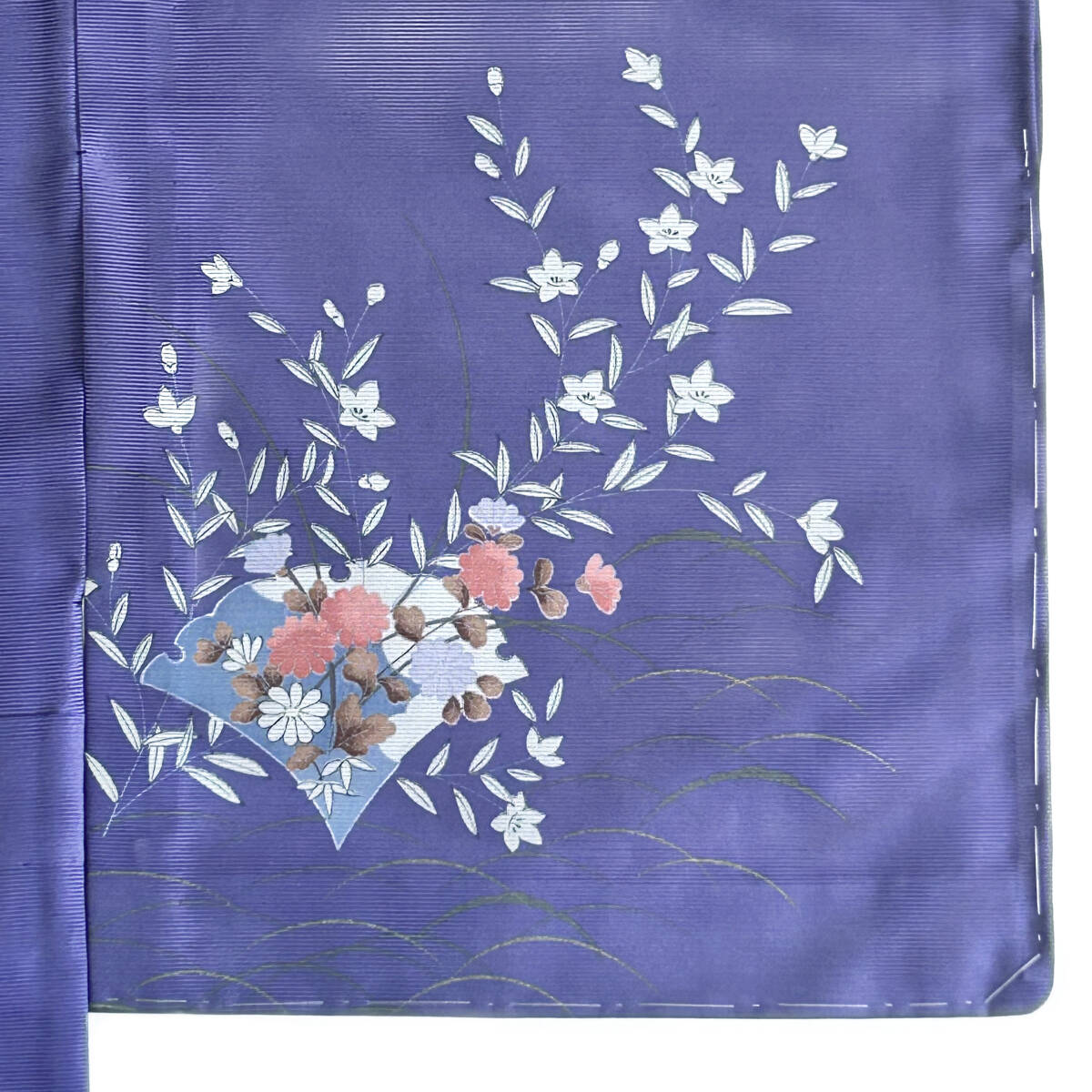 ブルーパープルの絽地に、一部、金彩加工を用いながら桔梗・菊・芝草などが描かれた、これからの季節にお召し頂ける単衣のお着物です。どうぞこの機会にご検討下さい!
