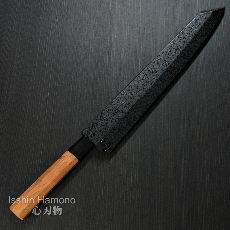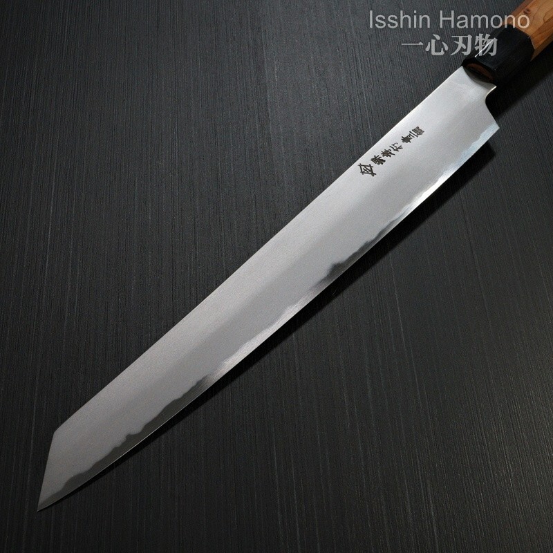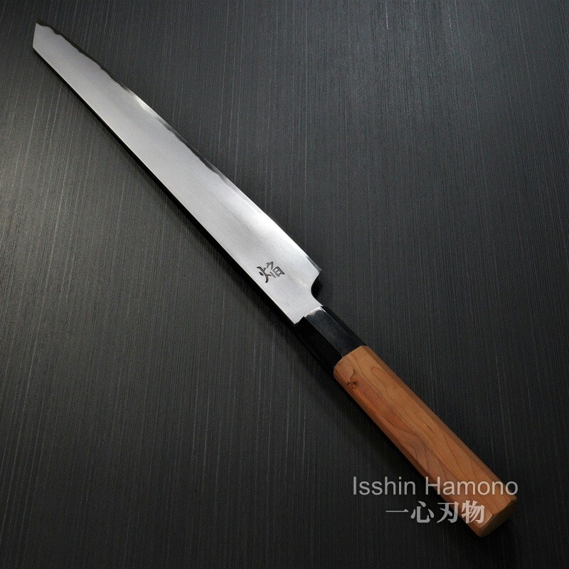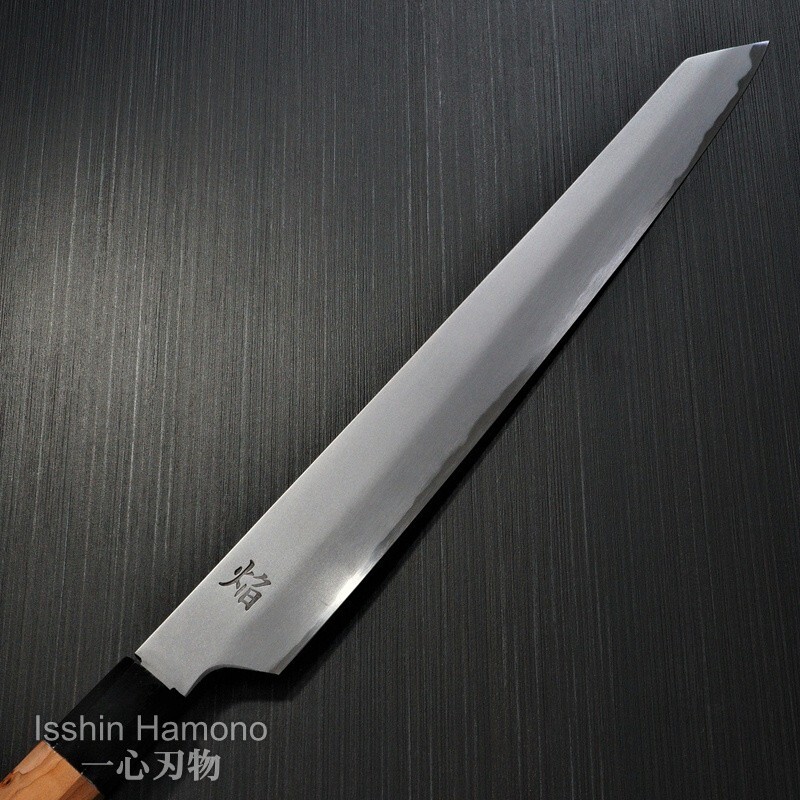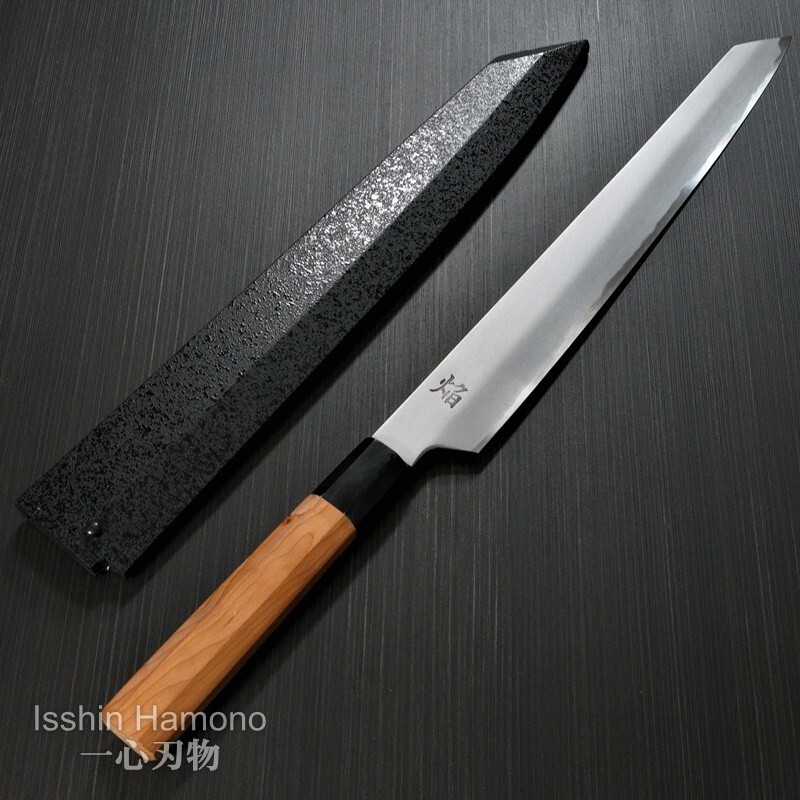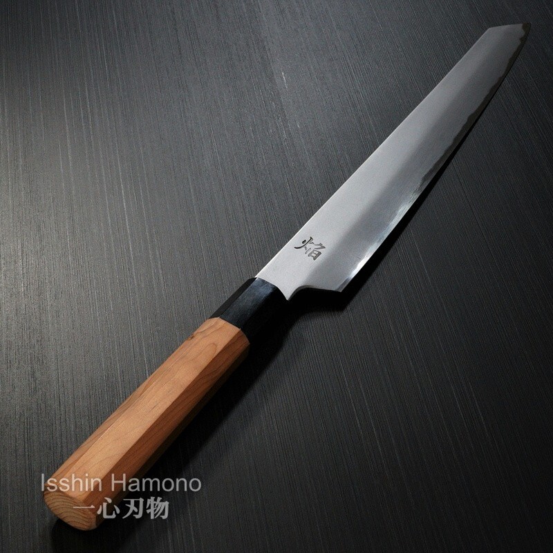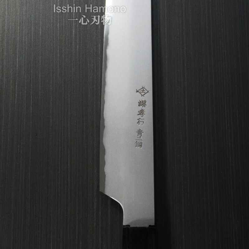 切れ味鋭く耐久性にも優れている安来青紙2号を使用し、両刃でありながら鋭い切れ味を堪能できる堺打刃物、真骨頂の和式包丁です。三代に渡り秘伝を技を受け継いた堺鍛冶師 土井逸夫氏による作品です。1本ずつ丹念に手造りした包丁は使う食材を選ばずに使用できます。