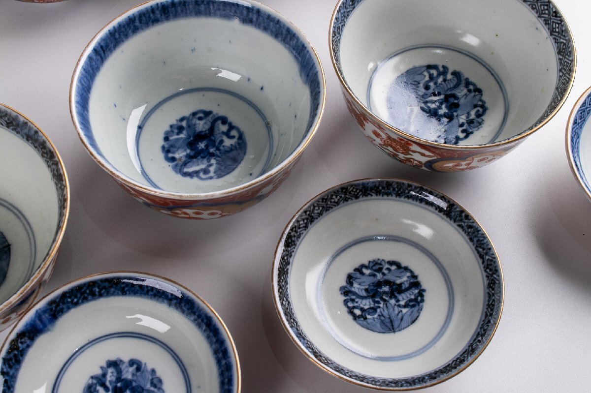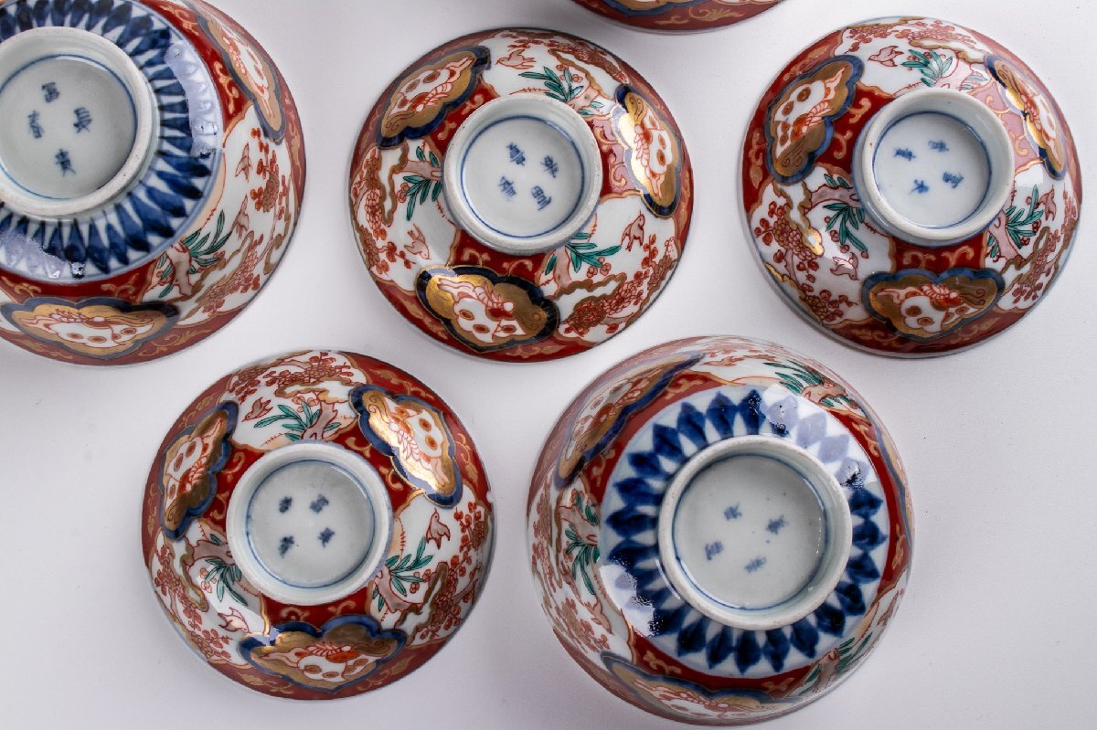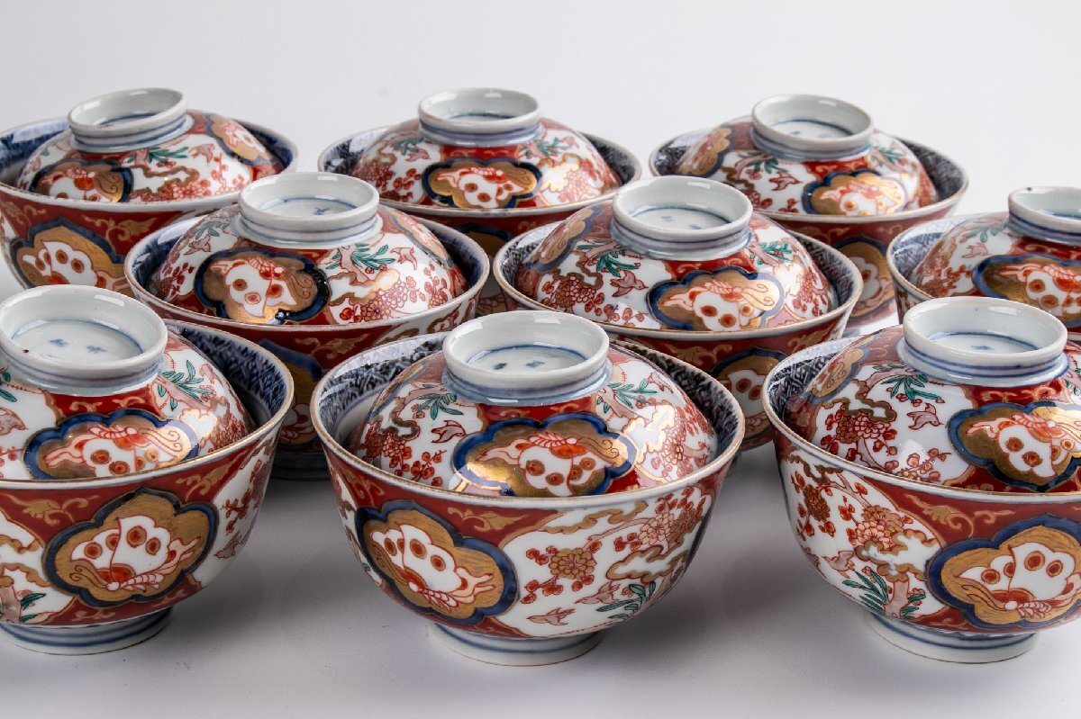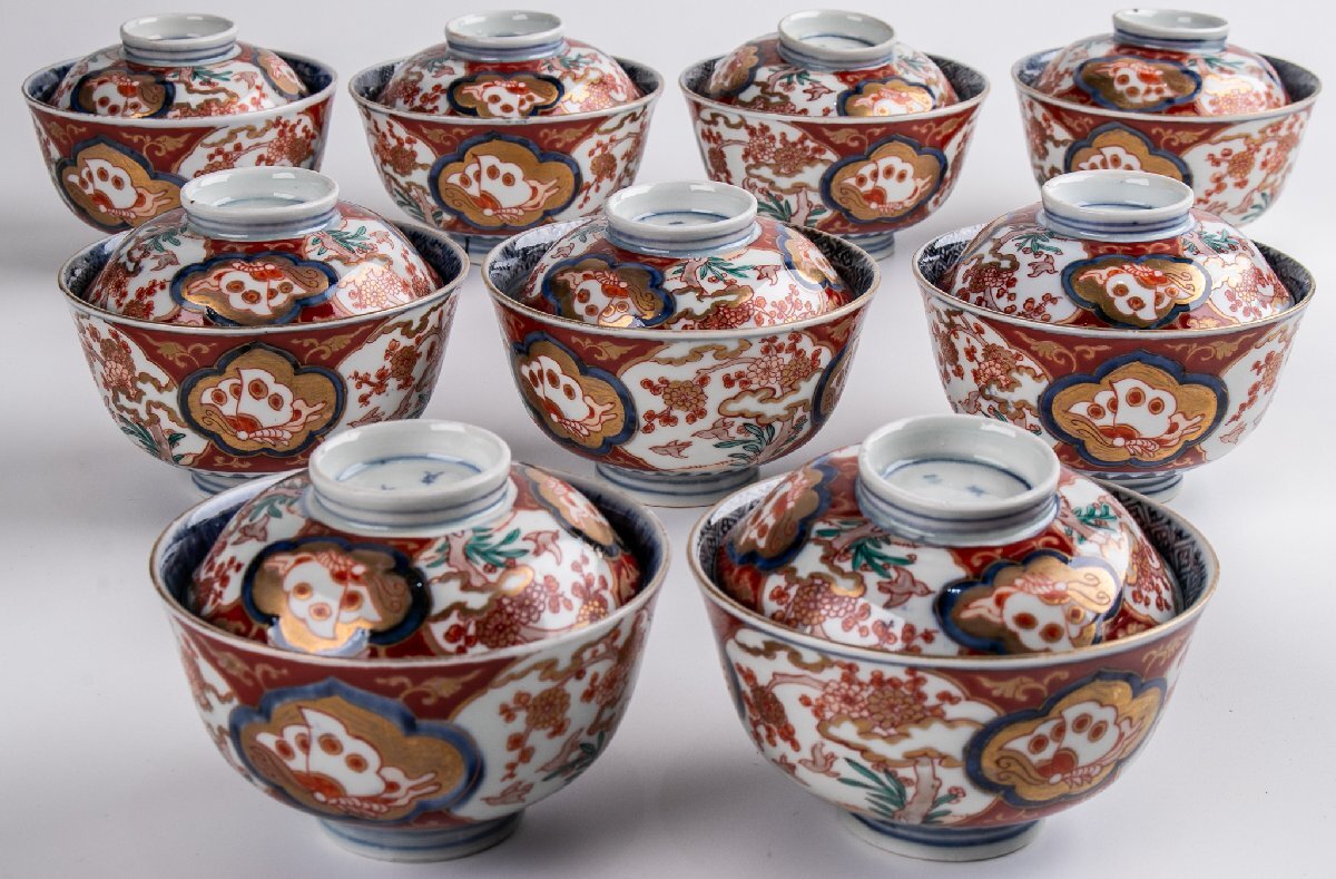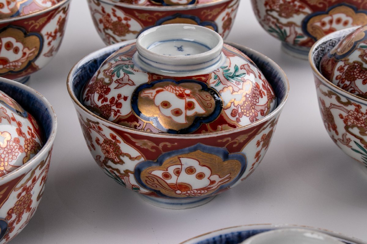 【うつわ】 古伊万里 染錦花鳥蝶文蓋茶碗 9客 明治時代 E2195B バラ売り可能です 古美術 骨董 古玩 陶磁器 和食器 日本料理 料亭