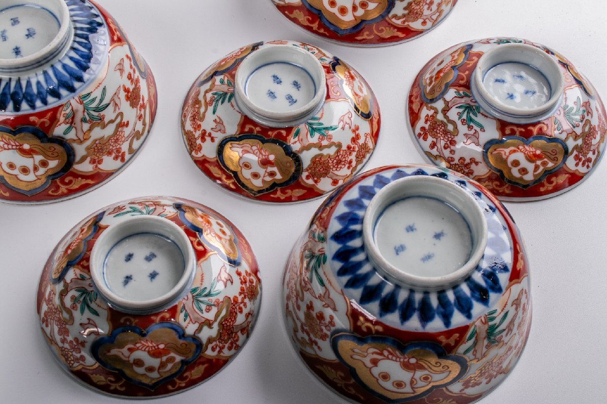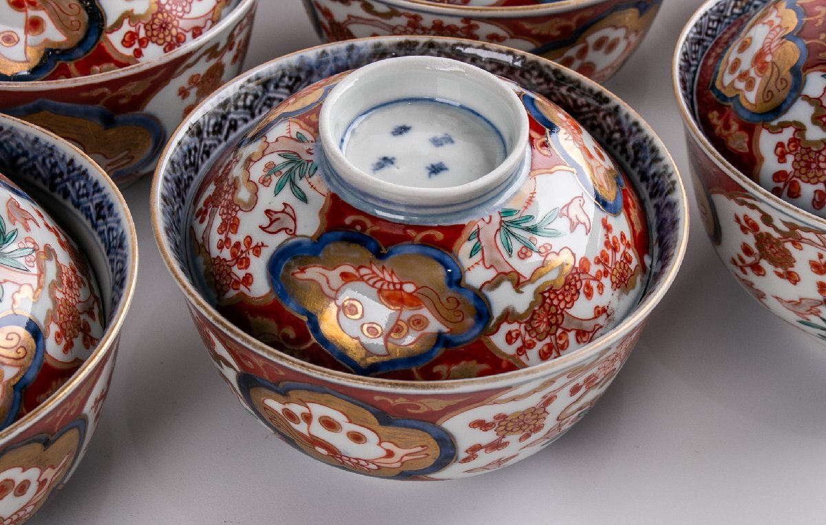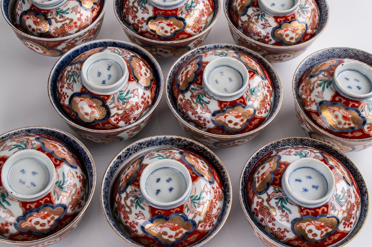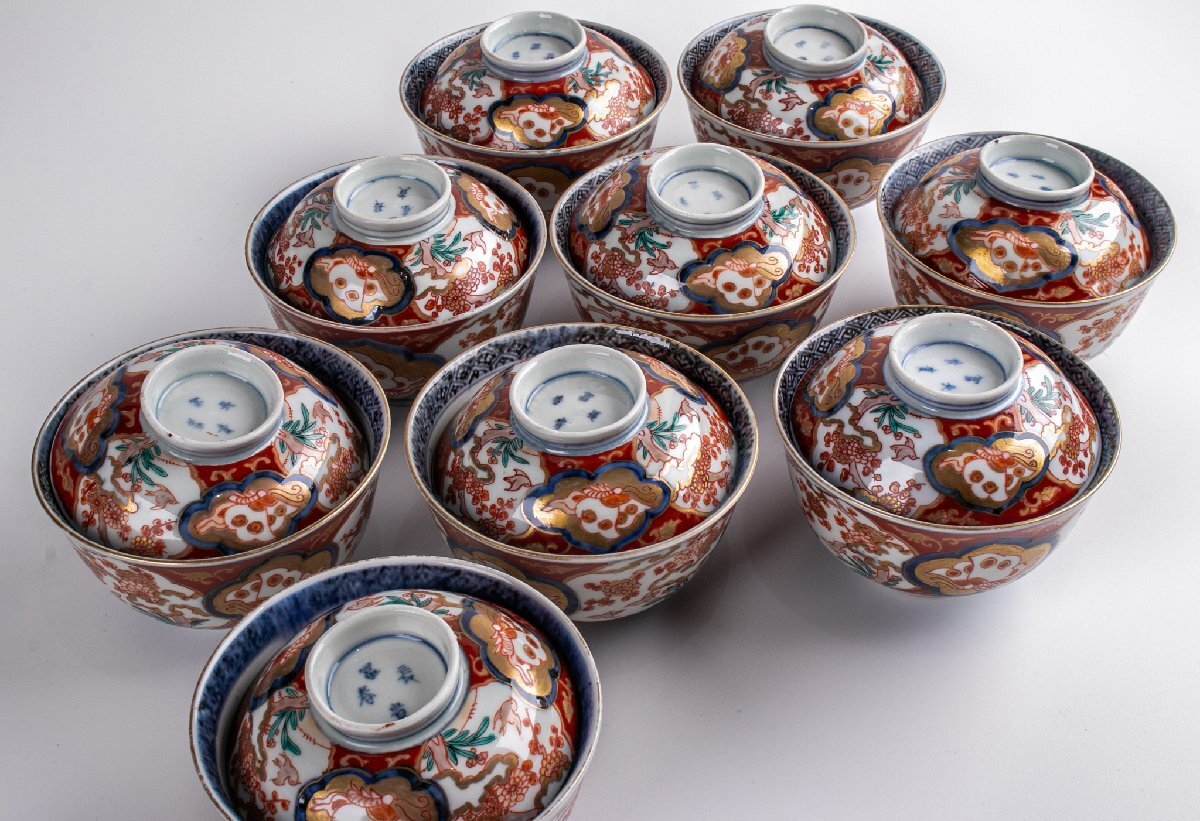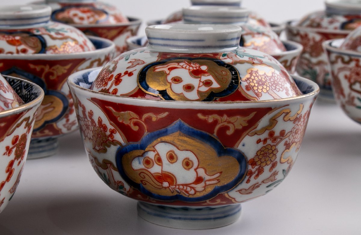 【うつわ】 古伊万里 染錦花鳥蝶文蓋茶碗 9客 明治時代 E2195B バラ売り可能です 古美術 骨董 古玩 陶磁器 和食器 日本料理 料亭