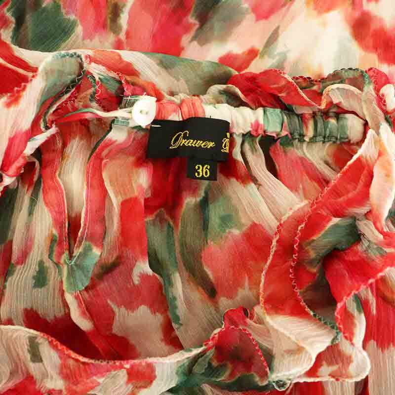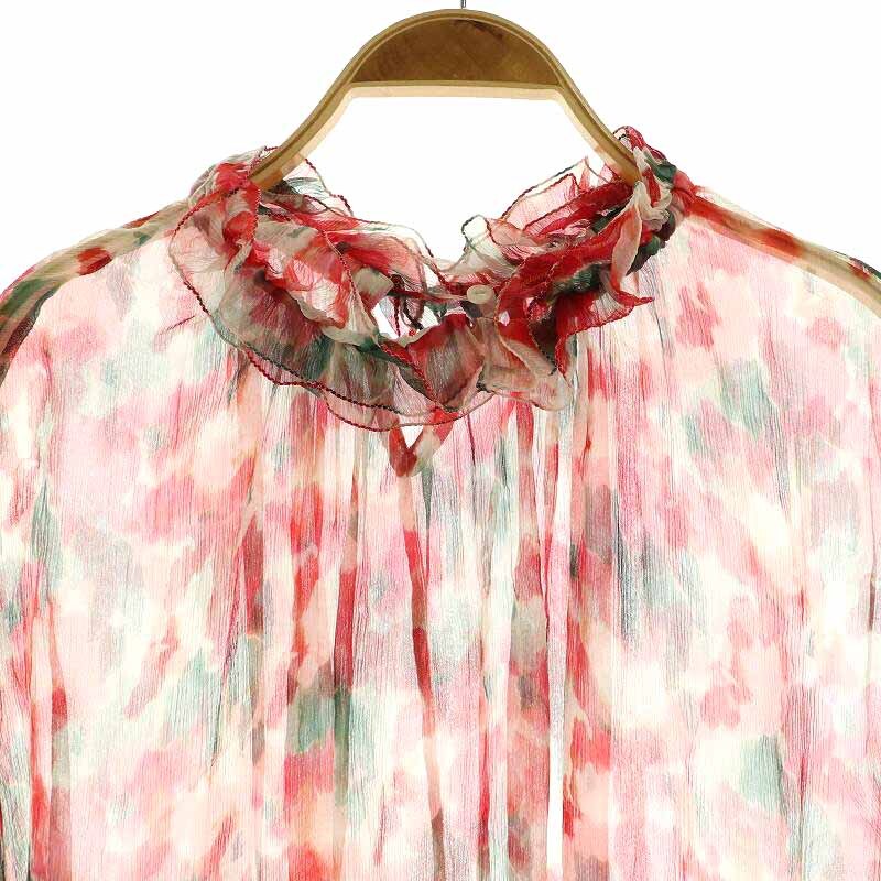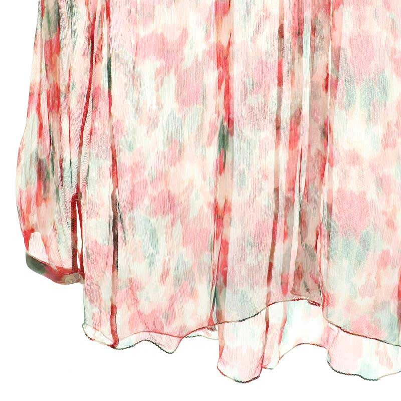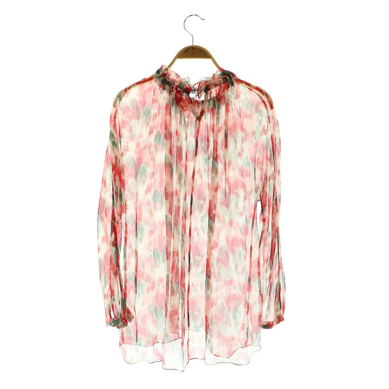 ドゥロワー 美品 25年 RESORT2 シフォンギャザーブラウス 長袖 シルク 総柄 フリル シースルー 36 レッド /MY ■OS