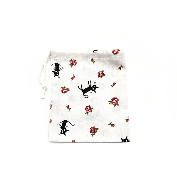 ミニ巾着袋・SS袋【黒猫&バラ柄 ホワイト】マチ無し 日本製 巾着 ポーチ 菓子袋 小物入れ 小さい袋 プレゼント 花 薔薇 ローズ ネコ ねこ
