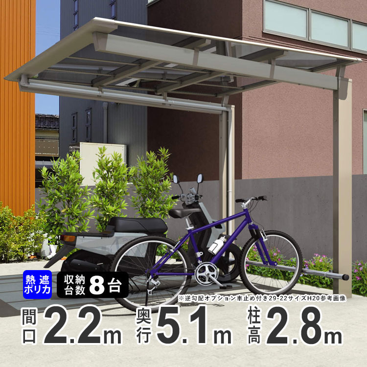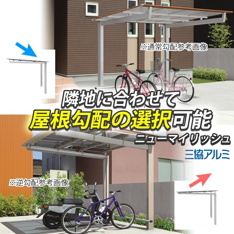 商品詳細 | 三協アルミ の人気商品カーポートシリーズのミニタイプ『ニューマイリッシュミニ』 屋根勾配が選択できるサイクルポート。 通常勾配と逆勾配が無料ご選択出来る自転車置き場屋根です。 |