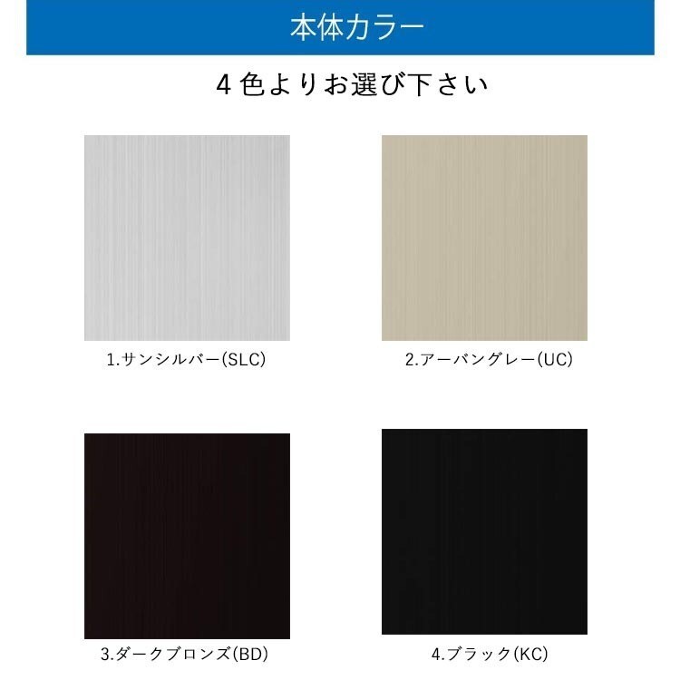 カラー | 本体カラー:サンシルバー、アーバングレー、ダークブロンズ、ブラック 屋根材:熱線遮断ポリカーボネート板屋根材カラー:ブルースモーク、かすみ調 |