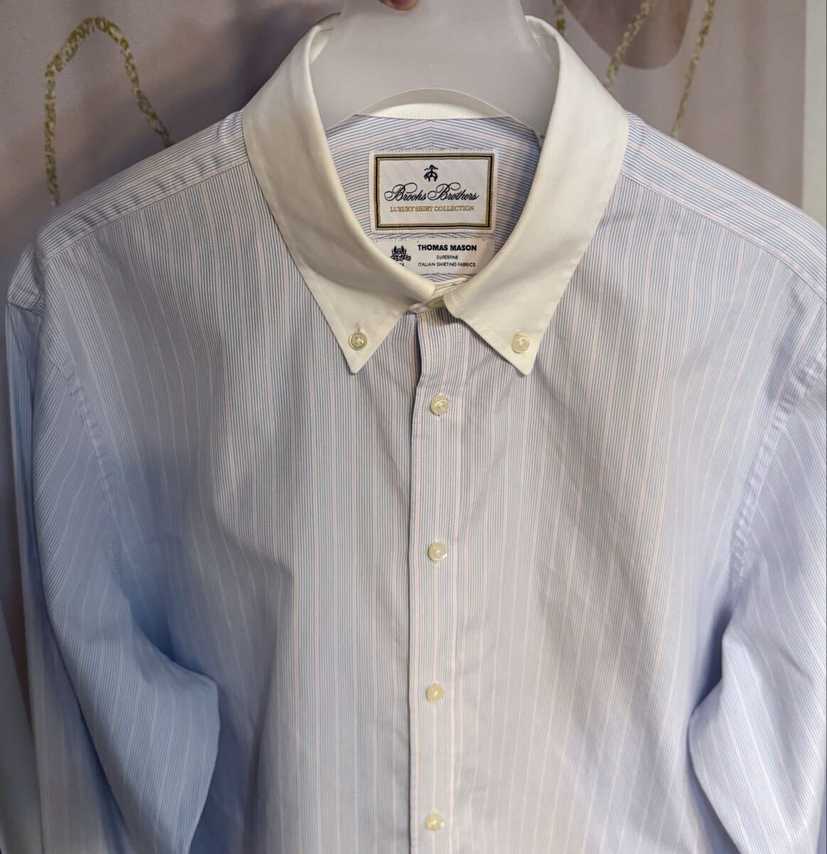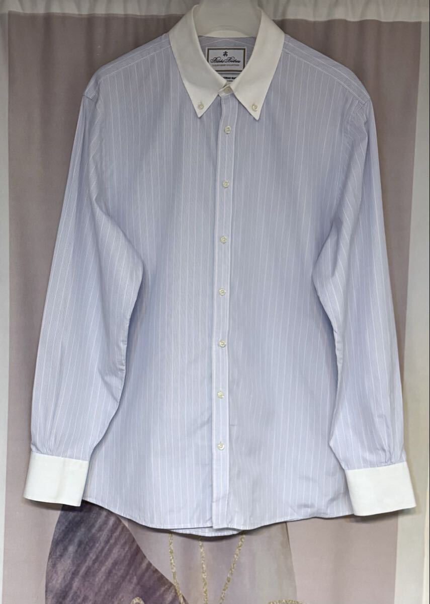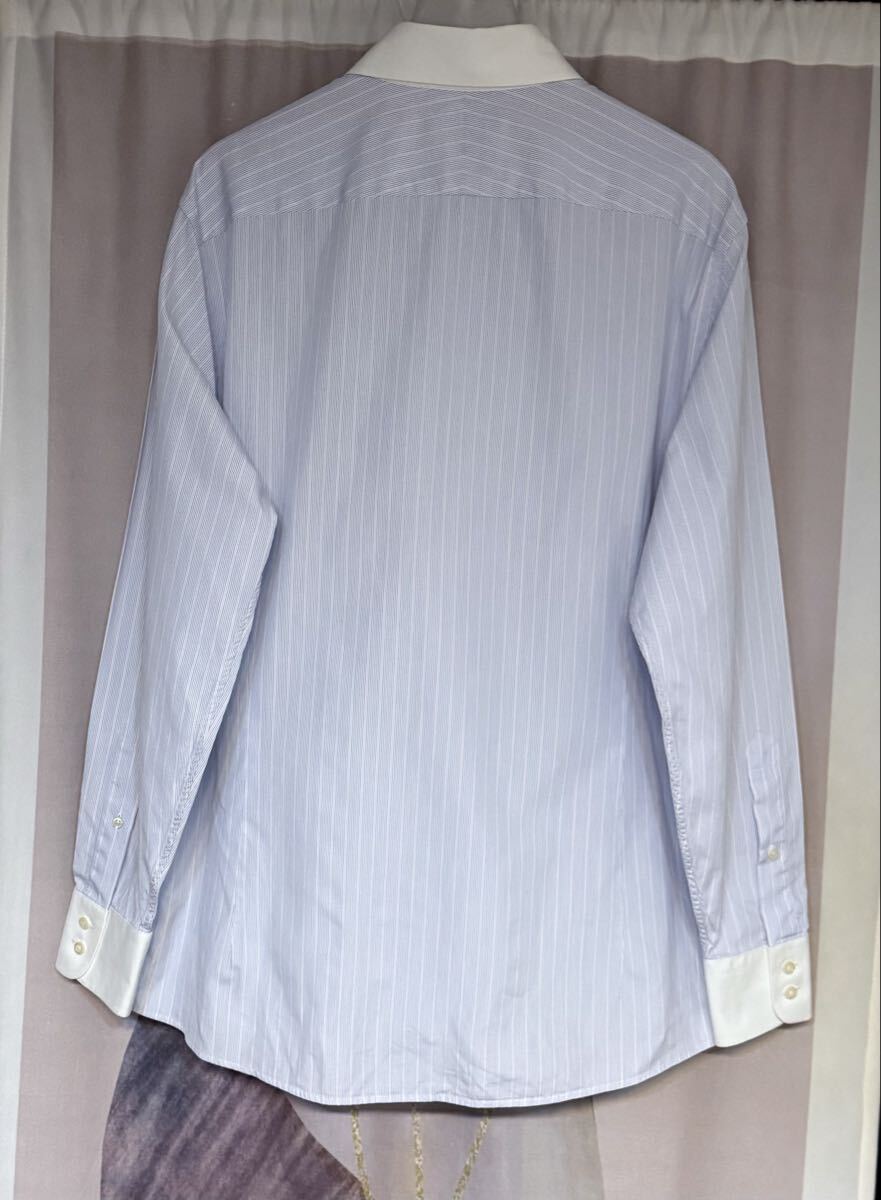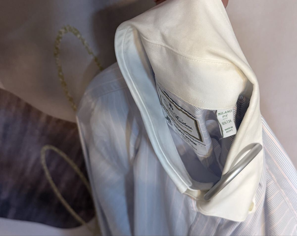 ・最高級ラインのラグジュアリーシャツコレクションから、上質なエジプト製のコットン100%の生地をトーマスメイソンが厳選した、マルチカラーのストライプとクレリックのデザインと光沢感のあるシェルボタンがあしらわれた着心地の良いミラノフィットのボタンダウンドレスシャツとなります。