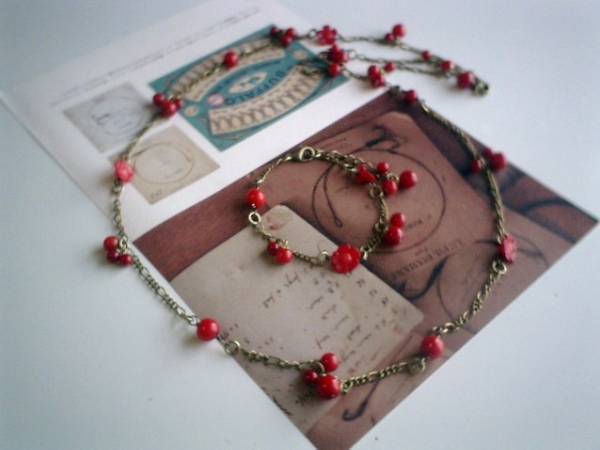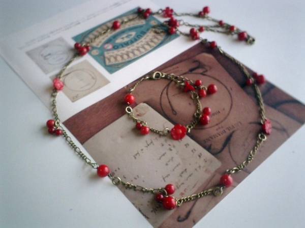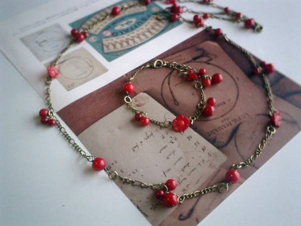 ロマンチックを紡いで・・シリーズです♪深い赤のお花・・シックな赤の珊瑚とお花のネックレスとブレスレット2点セットです♪4ミリ、6ミリ、8ミリの丸玉の珊瑚に8ミリから11ミリ位までの珊瑚のお花を合わせて可憐な表情です♪ネックレスの長さは全長80センチ位です♪2連にされたりラリエット風にされても素敵です♪ブレスレットは23センチ位で調節自由です♪それぞれ単品やピアスも出品しています♪シンプルで飽きのこないいつまでも着けられるデザインを考えて作りました!ハンドメイドをご理解頂いてノークレーム、ノーリターンでお願いします