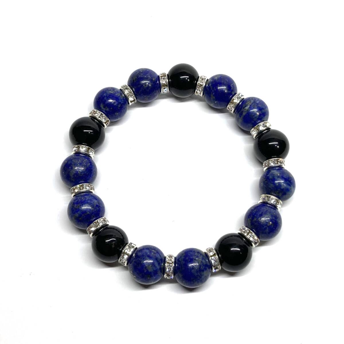 こちらは、ラピスラズリとオニキスを組み合わせたパワーストーンブレスレットです。間にはロンデルを挟み高級感あるデザインに仕上げております。程よくインパクトがある12mm玉を使用して内周約18cmです。(サイズ変更の場合は取引ナビにてご連絡をお願いします。) 数に限りがございますので気になる方はお早めにどうぞ。