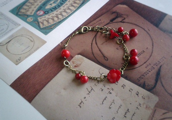 ロマンチックを紡いで・・シリーズです♪深い赤のお花・・シックな赤の珊瑚とお花のブレスレットです♪4ミリ、6ミリ、8ミリの丸玉の珊瑚に8ミリから11ミリ位までの珊瑚のお花を合わせて可憐な表情です♪長さは全長23センチ位です♪お揃いのネックレスやピアスも出品しています♪シンプルで飽きのこないいつまでも着けられるデザインを考えて作りました!ハンドメイドをご理解頂いてノークレーム、ノーリターンでお願いします