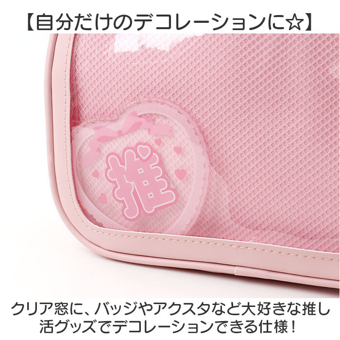 | 商品説明 | ・・【普段使いもできる推し活グッズ】 ・普段使いも推し活もお任せ☆ミニマルに持てる痛バッグが新発売。 ・【自分だけのデコレーションに☆】 ・クリア窓に、バッジやアクスタなど大好きな推し活グッズでデコレーションできる仕様! ・【バッグを傷つけないプレート】 ・バッジを刺せる専用のメッシュプレート付き。バッグを傷つけないのも嬉しいポイント。 ・【ストラップが付けられるDカン】 ・クリア窓のポケットにはDカンも搭載し、ストラップやキーホルダーを飾るのに便利◎ ・【レザー調で普段使いもOK】 ・ワンカラーのレザー調デザインが魅力。デコ窓を後にすれば普段使いもできる優れモノ。※ ・(※)カラーによりエナメル調やマット調など合皮の質感が異なります。 ・【マストなアイテムをIN】 ・お財布やコスメポーチ、手帳などマストなアイテムが入るサイズ☆ ・【小物収納ポケットも搭載】 ・外側と内側に小物収納ポケットを搭載し、チケットなどすぐに取り出したい小物をIN ・【ライブ等で活躍する2WAY】 ・斜め掛けも可能なショルダーつき!イベントやライブで、ハンズフリーで動けるのが嬉しい♪ ・【流行りの見せる収納にも】 ・推しグッズの他、スマホやミニポーチなどを入れてトレンドな見せる収納にもオススメ♪ ・【ポケット仕様】 ・メイン収納・・・オープンポケット×1 ・フロント・・・ファスナーポケット×1(クリア窓仕様) ・背面・・・ファスナーポケット×1 |