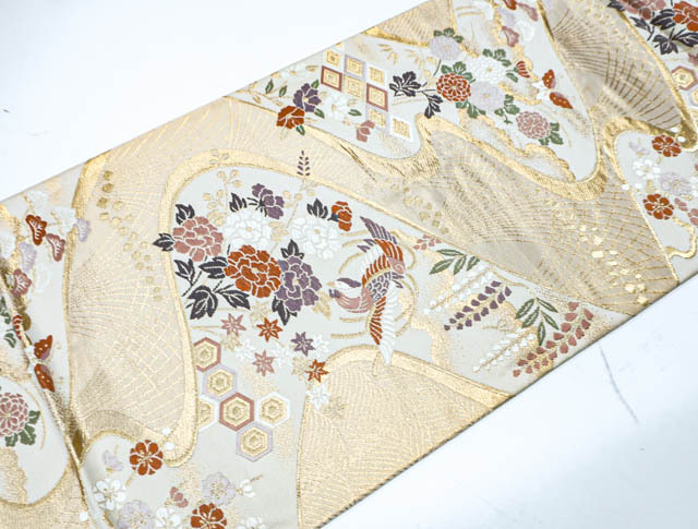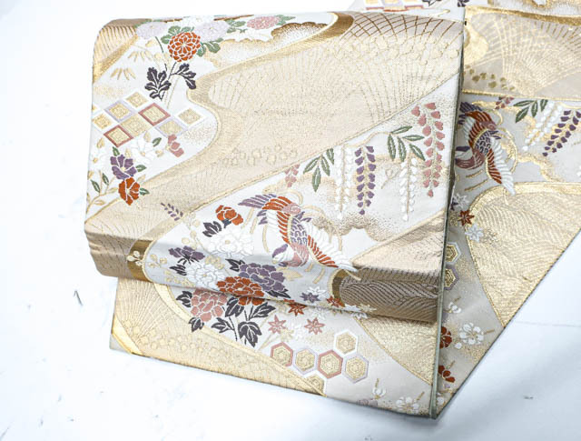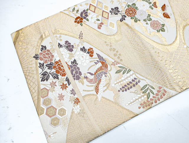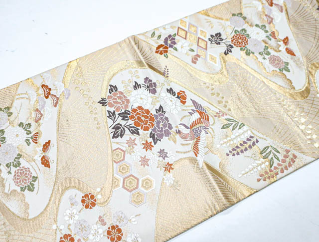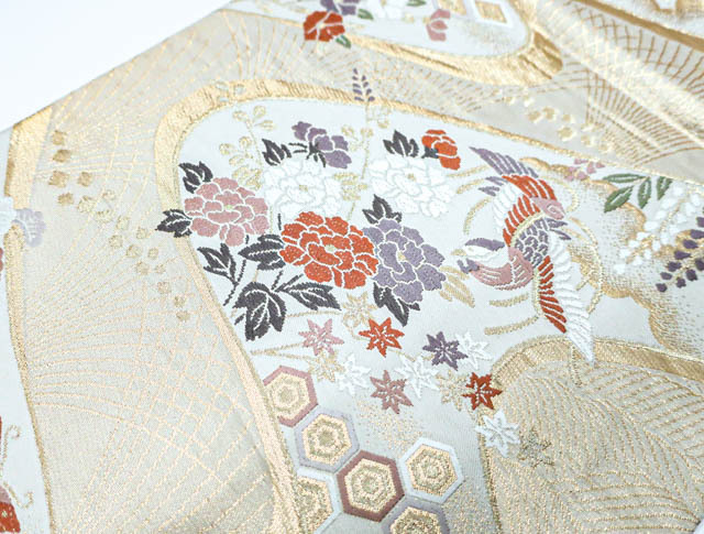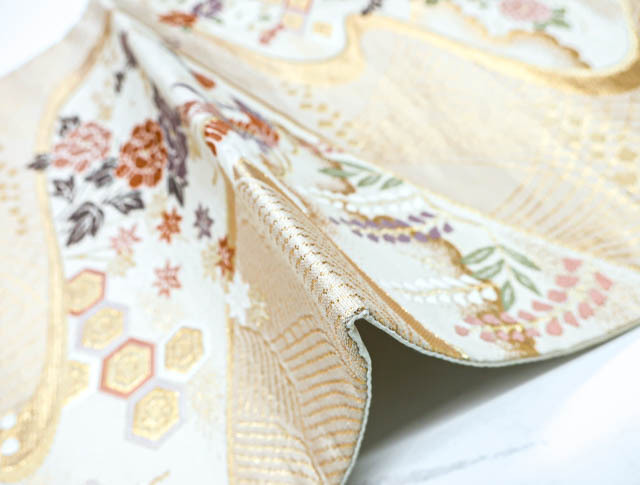 リサイクルのため、無地場裏地に汚れがございますが着用いただけると存じます。 地色はアイボリーです。 1枚目の画像が近いお色かと思われます。 素材は正絹です。 |