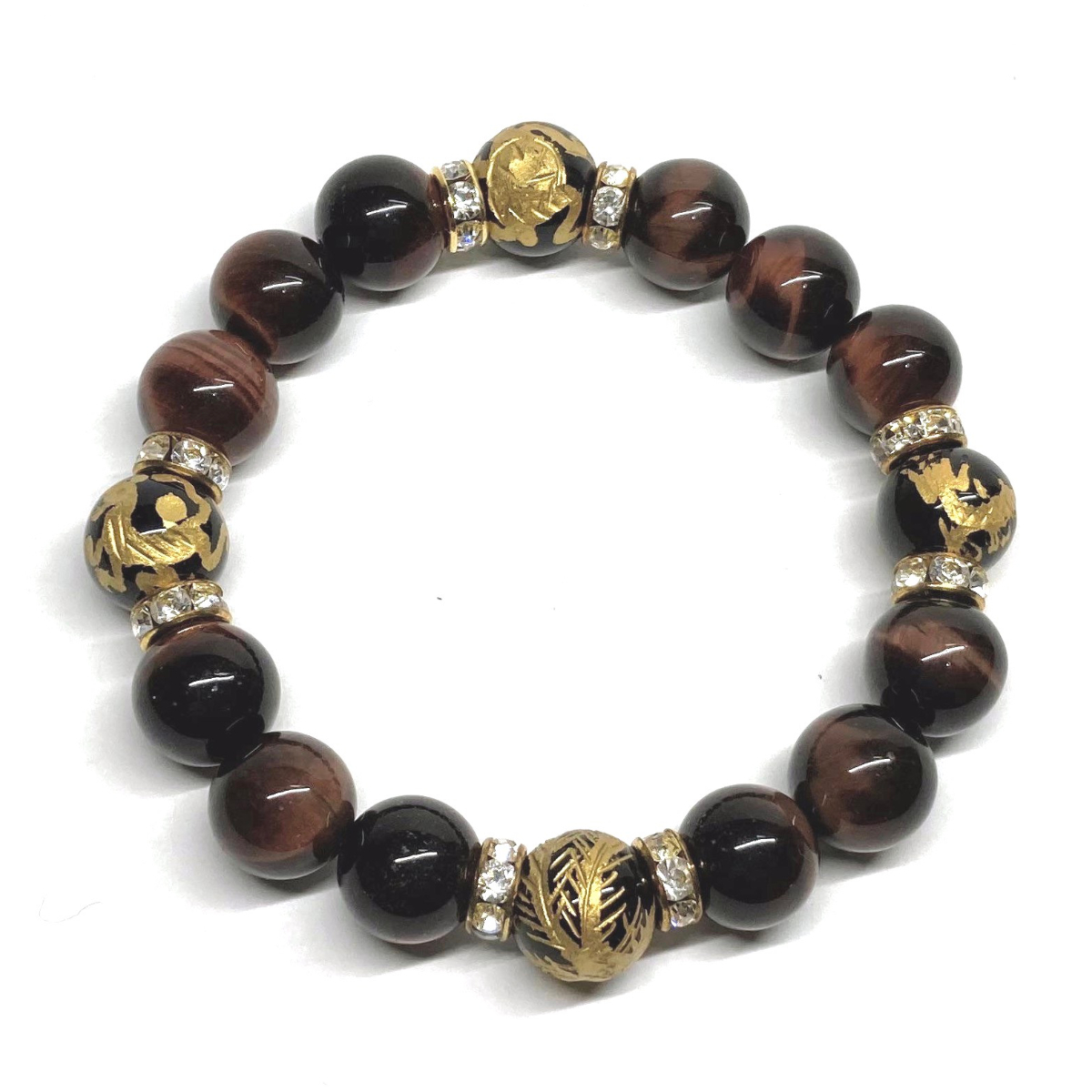 こちらは、四神獣金彫オニキとレッドタイガーアイを組み合わせたパワーストーンブレスレットです。四神獣は、中国の伝説で4つの方向(東西南北)を守護する神聖な神。四神獣、厄災から身を守り、多くの運気を呼び込むと言われております。石大きさは程よくインパクトのある12mm玉で内周 約17cmです。 数に限りがございますので気になる方はお早めにどうぞ。