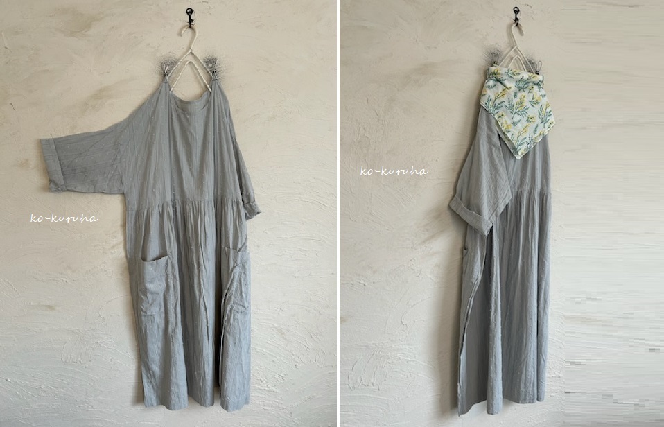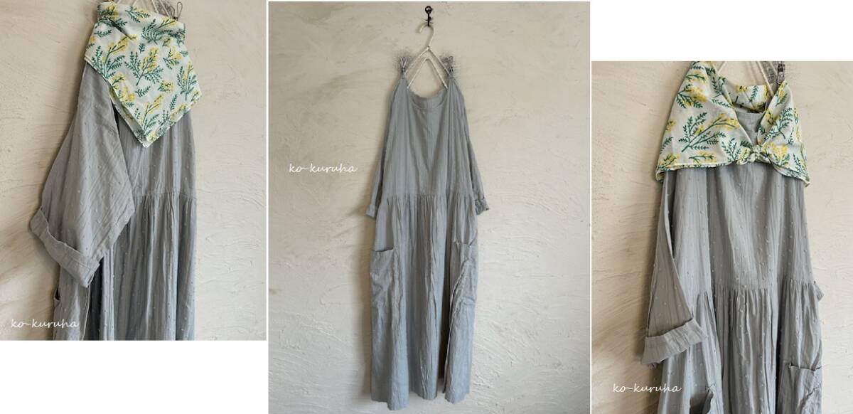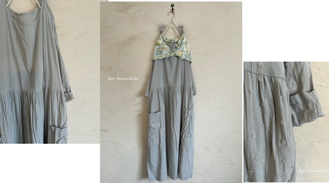 ベースはカラミ織のドビーが入っていて高級感があり、とてもおしゃれです。カラミ織により、シワがいきにくい特徴があり、しっとリ感のある軽い手触りのワンピースです☆彡ポケットは前面左右についています。(M~Lサイズを目安にお作りしています。細かい採寸が気になる方はご質問下さい、なお忙しくてお返事できない時があります。ごめんなさい。なるべく早めの質問をお願いできたらと思います作業場と生活環境が同じなので臭い移りがあったらごめんなさい) 寸法は 肩幅 約40cm(ドロップショ ルダーなので目安に)・身幅 約61cm 着丈(背中中心首元から裾まで) 約103cm 袖丈(首元から袖口まで) 約50cm・袖口幅 約19cm・裾幅 約97cm (若干の誤差はご了承くださいm(__)m)(只今お直しを承ることはできませんのでご了承ください)(色物生地は色落ちする場合がありますのでお洗濯には十分お気をつけください) | ||||||||