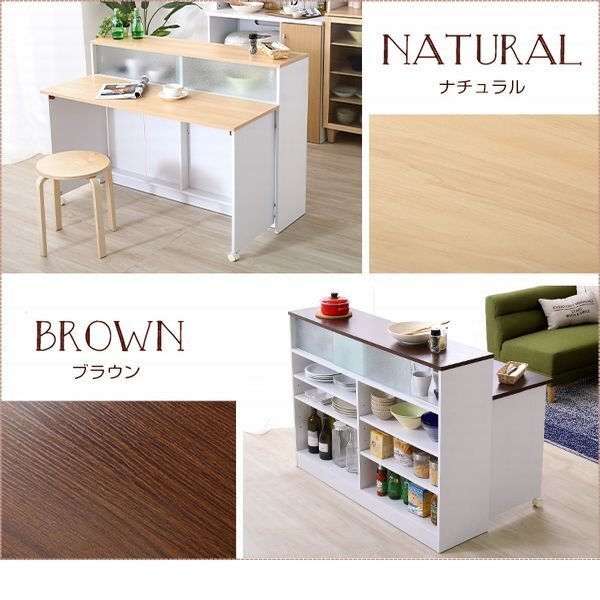 | 【ポイント】 ①キッチンと生活空間をオシャレに区切る間仕切りキッチンカウンターです。 ②必要な時だけ使える120㎝幅のバタフライテーブル付きです。 ③天板は耐熱・耐水・傷に強いメラミン化粧板を使用しました。 ④ミストガラスがオシャレな引戸収納は、前後どちら側からも利用可能です。 |