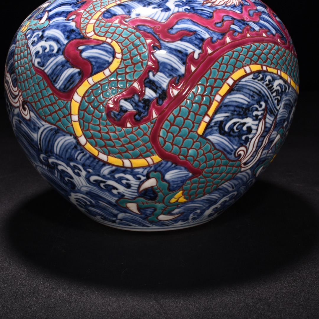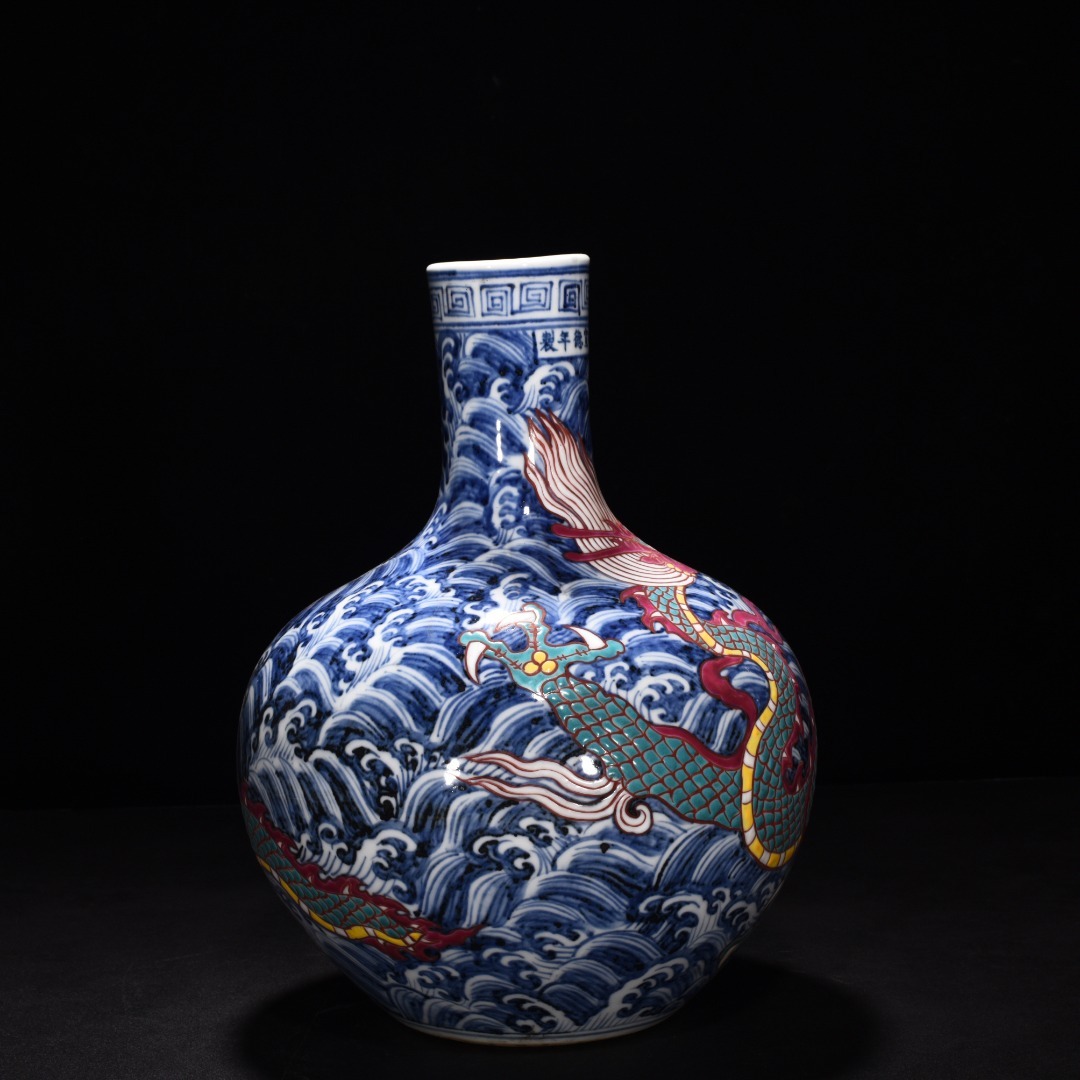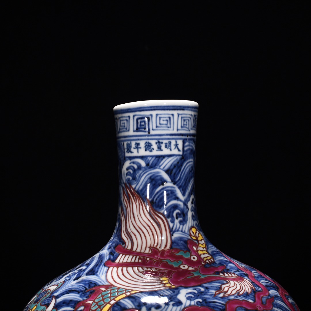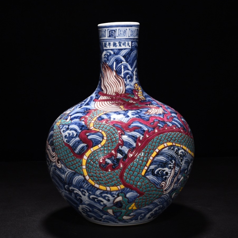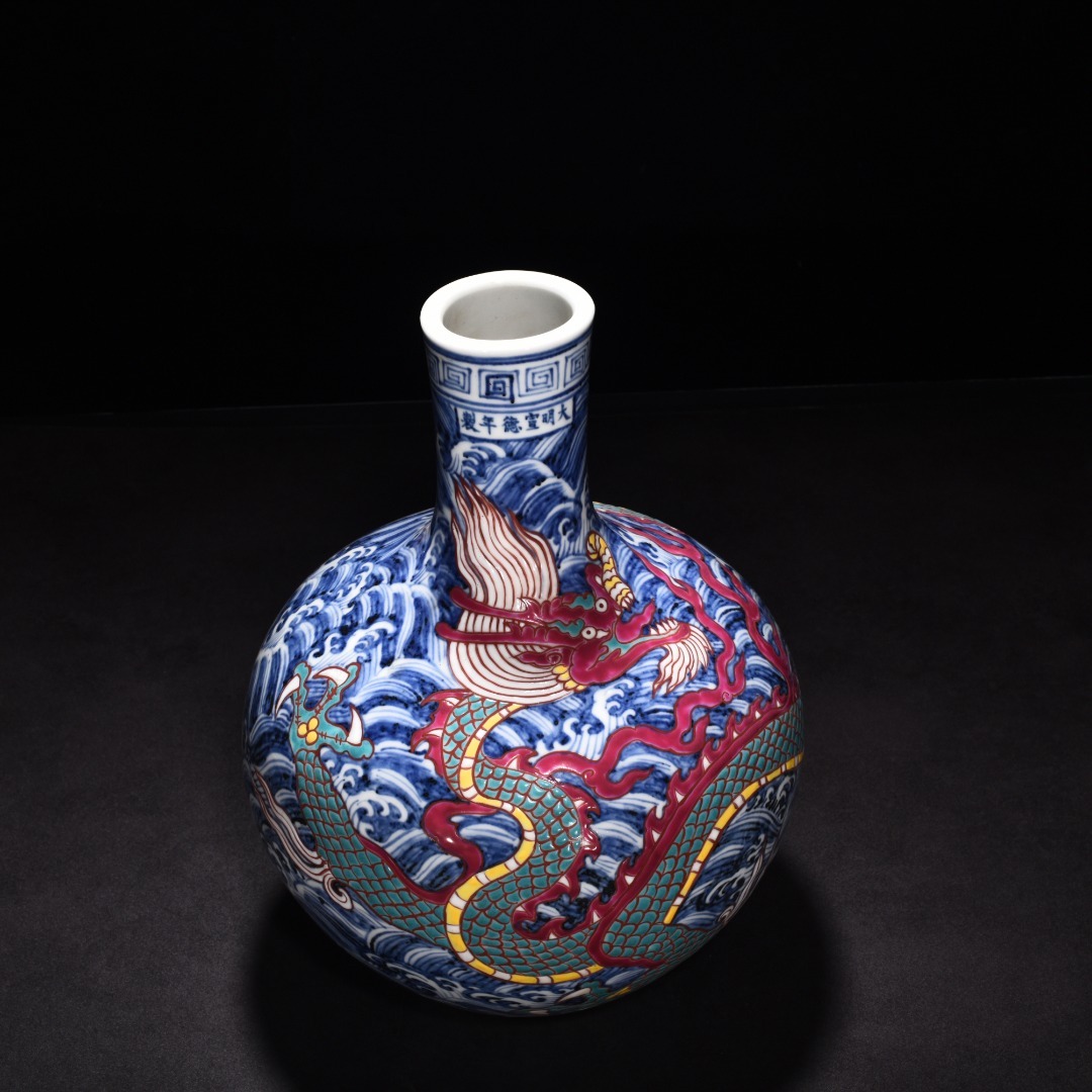 明時代 宣徳年製 青花五彩 海水龍紋 天球瓶 陶磁器 中国美術 唐物 古美術 置物 高さ31 cm 幅21.5 cm 818