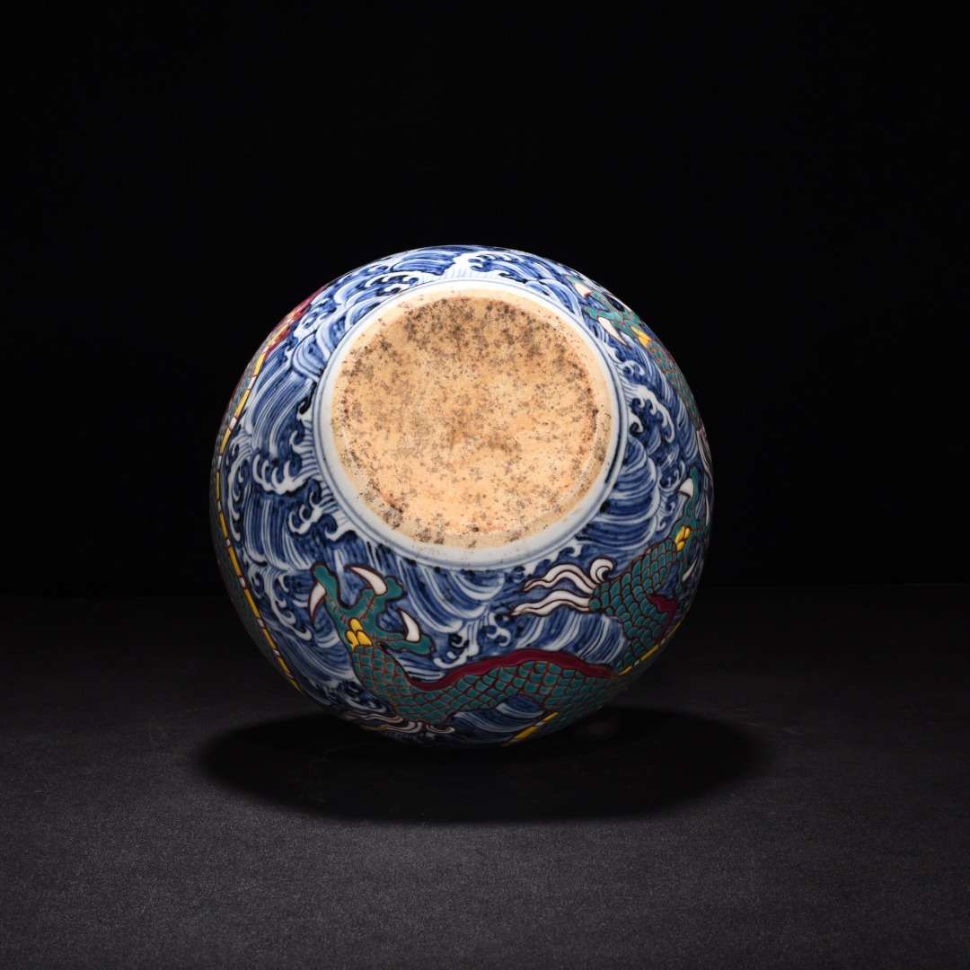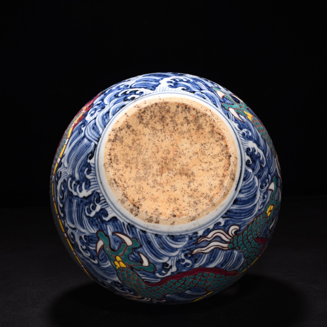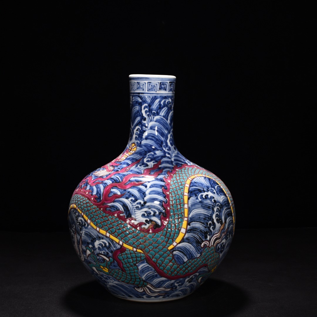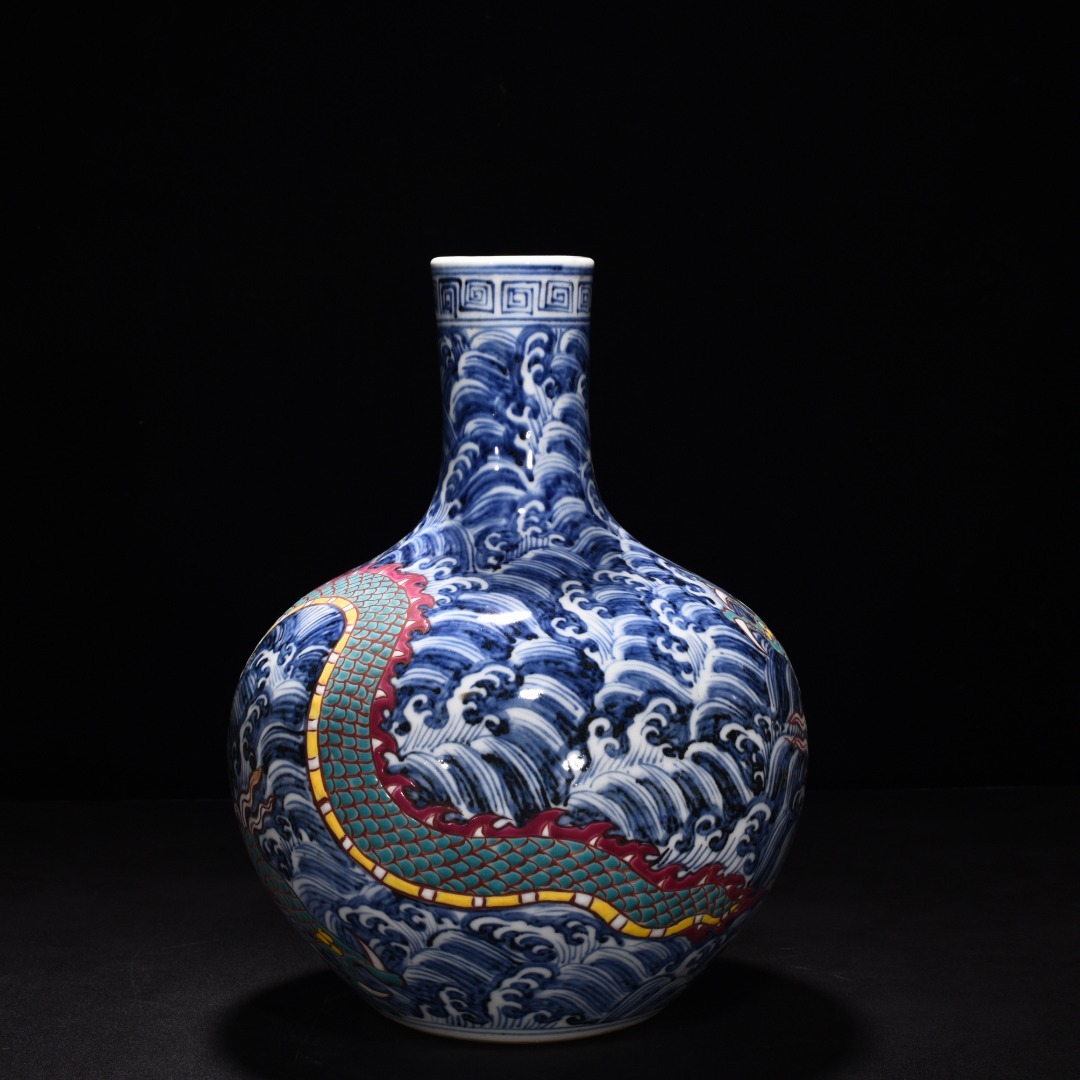 明時代 宣徳年製 青花五彩 海水龍紋 天球瓶 陶磁器 中国美術 唐物 古美術 置物 高さ31 cm 幅21.5 cm 818