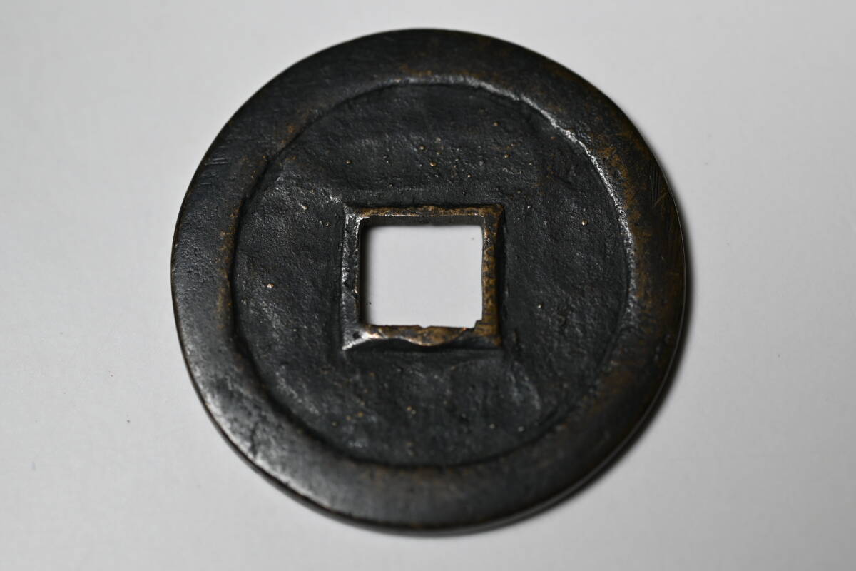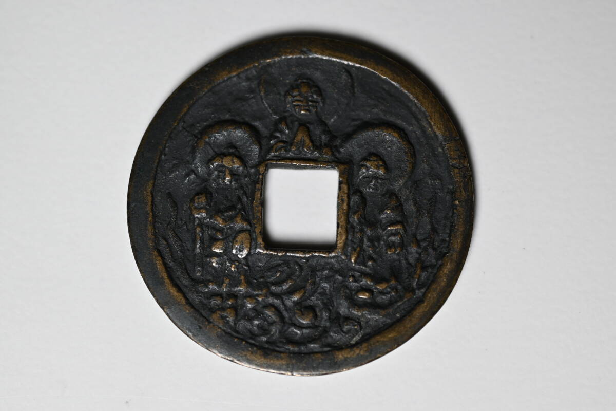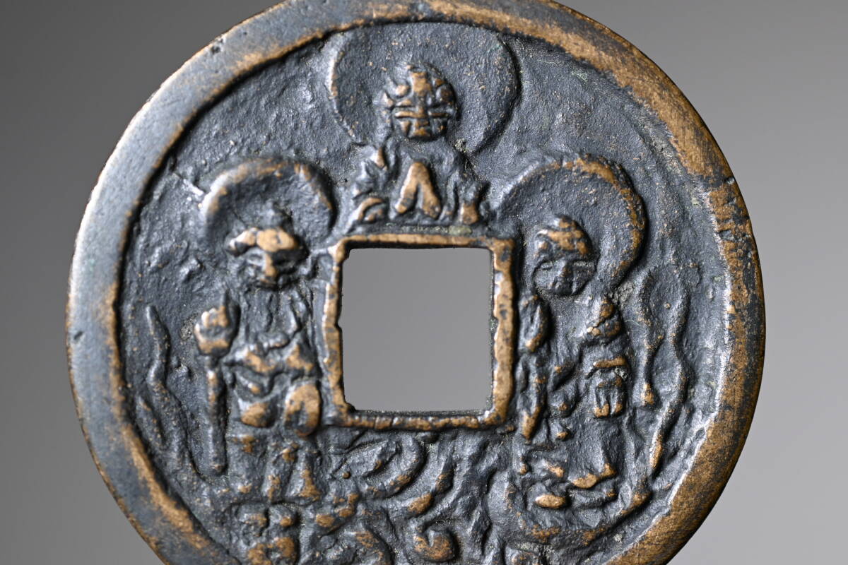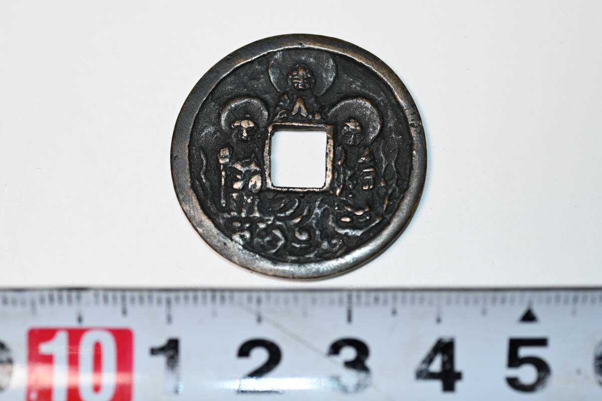 古銭 絵銭 三尊 福銭 仏銭 穴銭 重量約8.8g 径約31mm 三尊佛 阿弥陀如来 観音菩薩 仏教美術 佛教 | |||