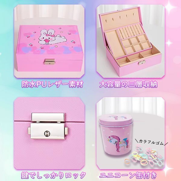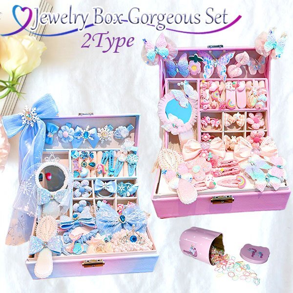 ☆ジュエリー BOX ゴージャス セット☆ ※落札しましたらご希望のデザイン(セット内容)をオーダーフォームにご記入下さい。 【デザイン】 ・ブルー ・ピンク 【商品名】 ジュエリー BOX ゴージャス セット 【商品説明】 キュートなジュエリーボックスが登場! 鍵付きだから大切なおしゃれアイテムをしっかり守れます。 中にはヘアピンやカラフルなヘアゴム、可愛いアクセサリー、ミラー付きコーム、キラキラの子供用リングなど、 夢のようなアイテムがぎゅっと詰まっています。 三重構造だから整理もしやすく、見た目もスッキリ。 おしゃれ心を育むだけでなく、大切なものを自分で管理する習慣も自然と身につきます。 お誕生日や特別な日のプレゼントにもぴったりなこのジュエリーBOX。 お子さまの「宝物」を詰め込むワクワクの空間を、ぜひプレゼントしてみませんか? 【セット内容】 「ブルー」 リボンヘアピン1個/青いヘアピン 14個/青いヘアゴム 10本/王冠ヘアゴム2本/ミラーコーム 2個/子供用リング 8個 「ピンク」 リボンヘアピン1個/ピンクのヘアピン 16個/ピンクのヘアゴム10本/花のヘアゴム 2本/ミラーコーム 2個/子供用リング 8個 ・ユニコーン缶…カラフルシリコンゴム 【サイズ】 収納ケース:約17×23×8.7cm ユニコーン缶:約8×7.5×9cm アクセサリー:商品画像をご参照ください |