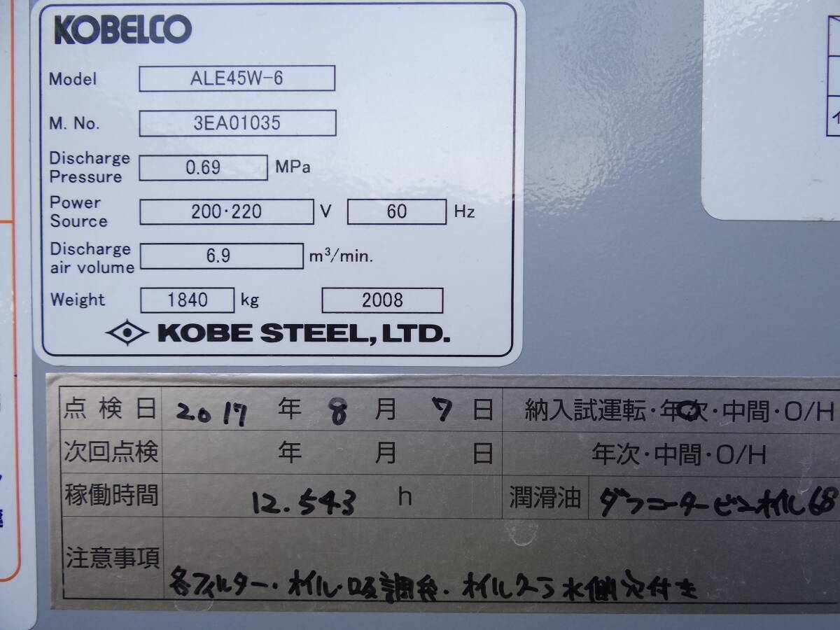 現状品 ジャンク KOBELCO コンプレッサー スクリュータイプ オイルフリー エメロード ALE45W-6 三相 200V 1840kg 生駒市北東部 引取り限定 | |