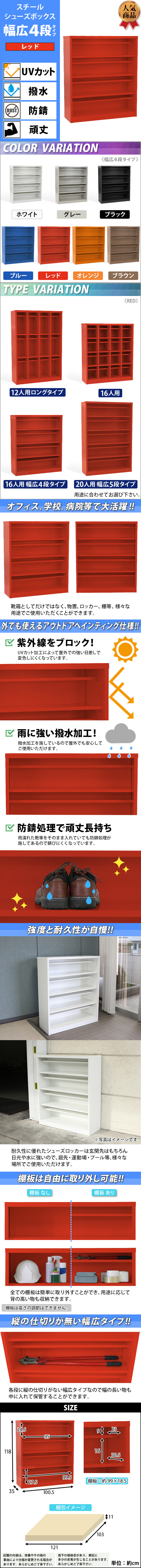 | 商品名 | 送料無料 ロッカー おしゃれ スチール シューズボックス 16人用 幅広4段タイプ オープンタイプ 赤 棚板付き 扉なし 1列4段 UVカット 撥水 防錆 頑丈 シューズロッカー シューズラック スリム 更衣ロッカー 靴箱 下駄箱 棚 物置 屋外 中棚 プール レッド sy2016bred |
