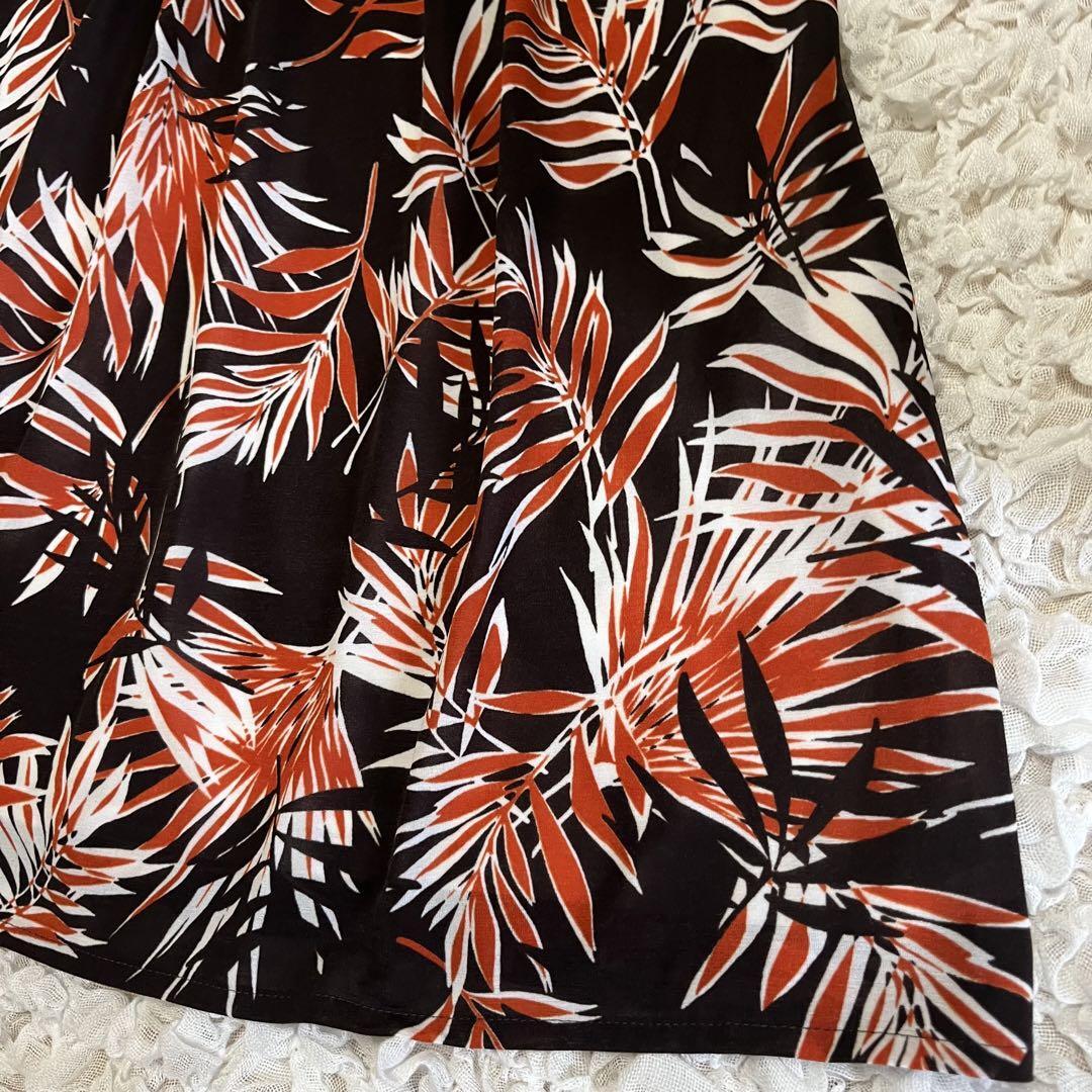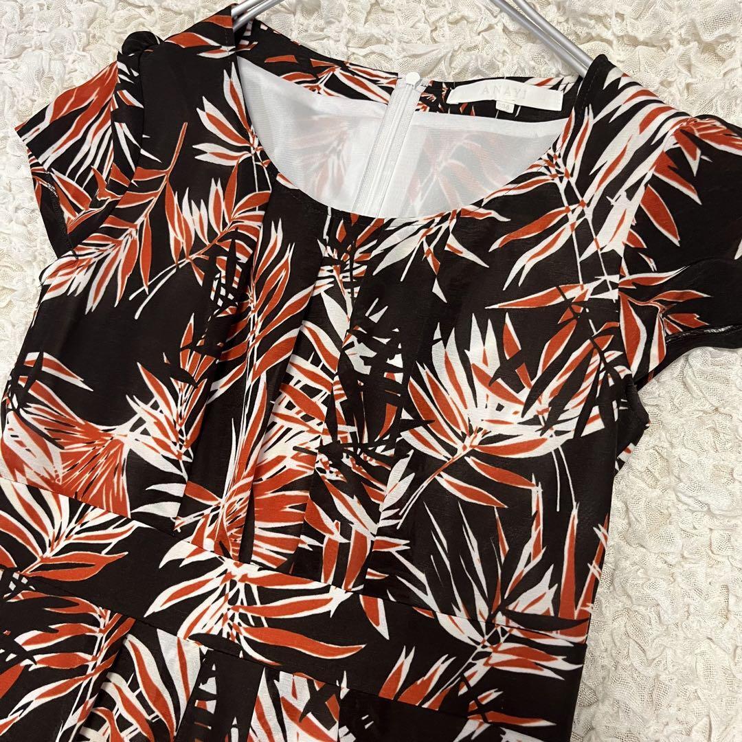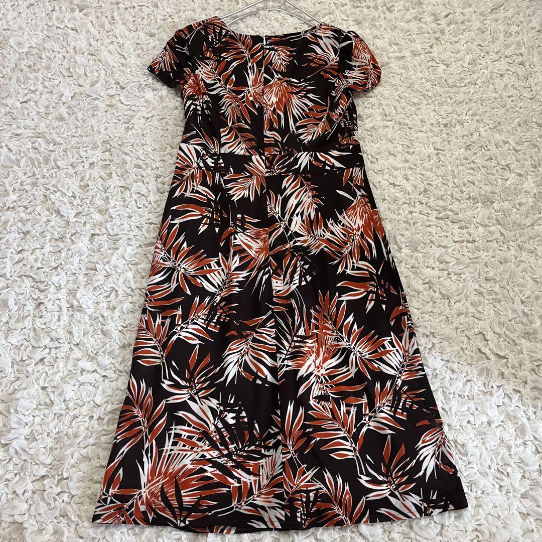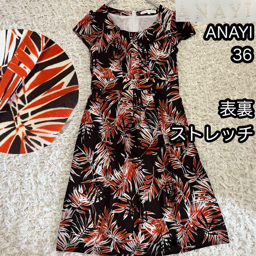■アイテム: ストレッチ【アナイ ANAYI】ヤシの葉っぱ 南国柄 総柄 膝丈ワンピース 36