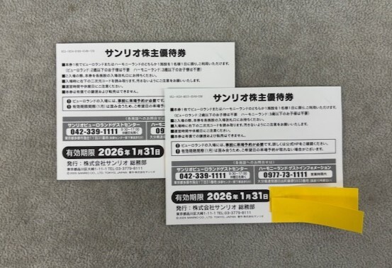 サンリオ 株主優待券 2枚(ピューロランド、ハーモニーランドで利用可)2026.1.31まで