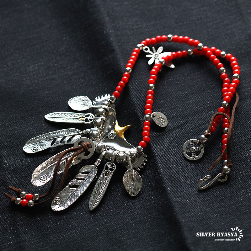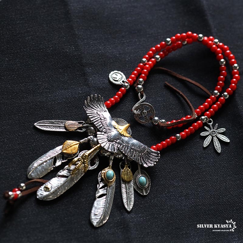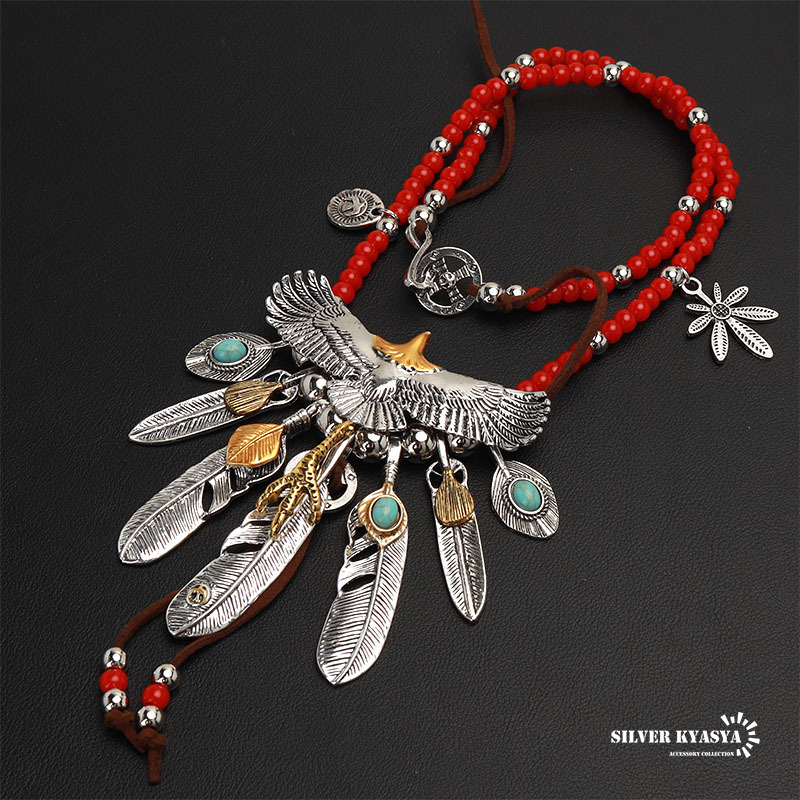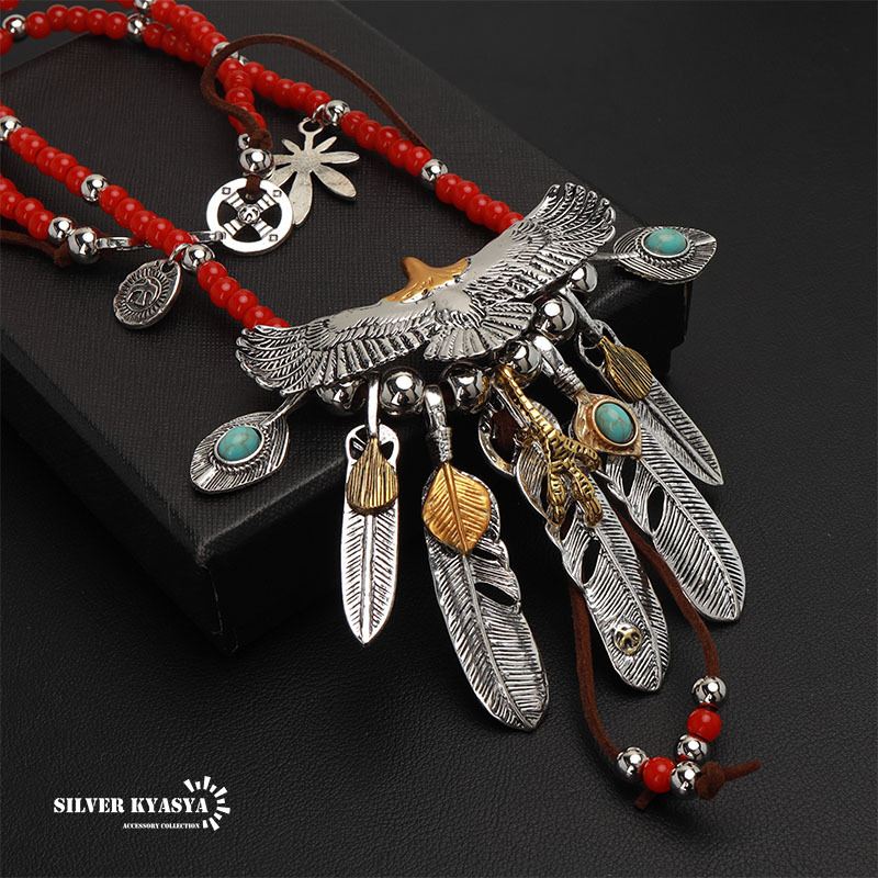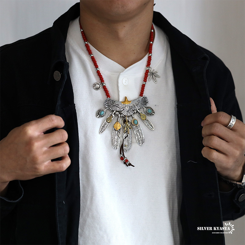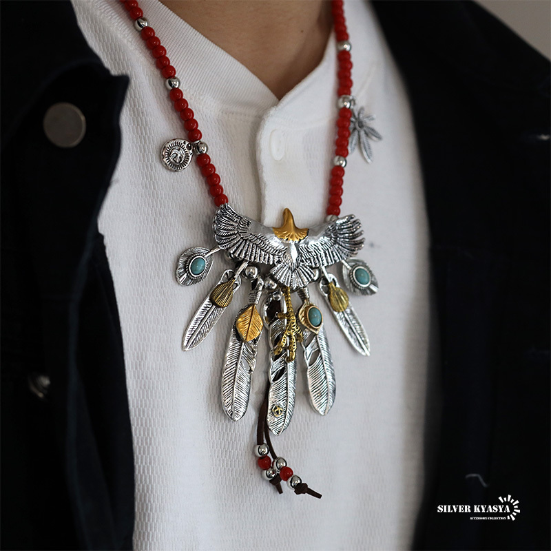 メンズアクセで不動の人気を誇るインディアンジュエリー。重厚感のある繊細な造りのモチーフをセットした贅沢なイーグルフェザーネックレスです!鮮やかなホワイトハーツと組み合わせ、インパクトのある仕上がり。