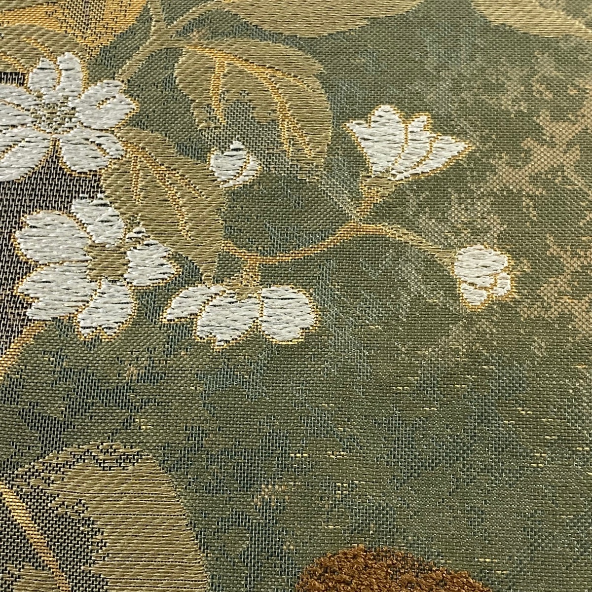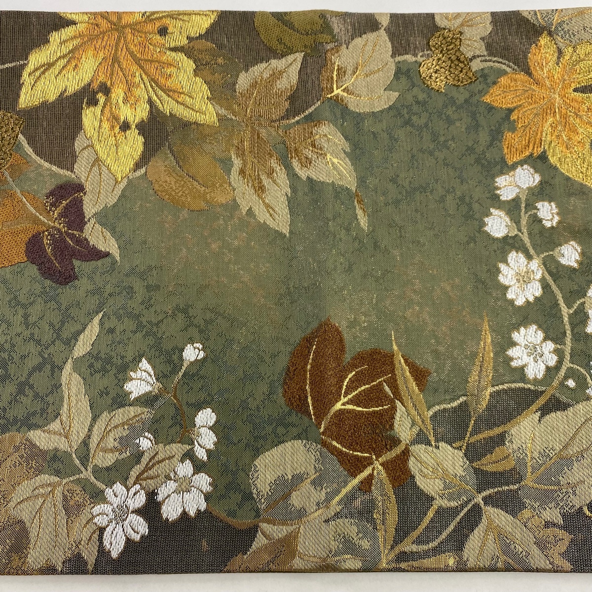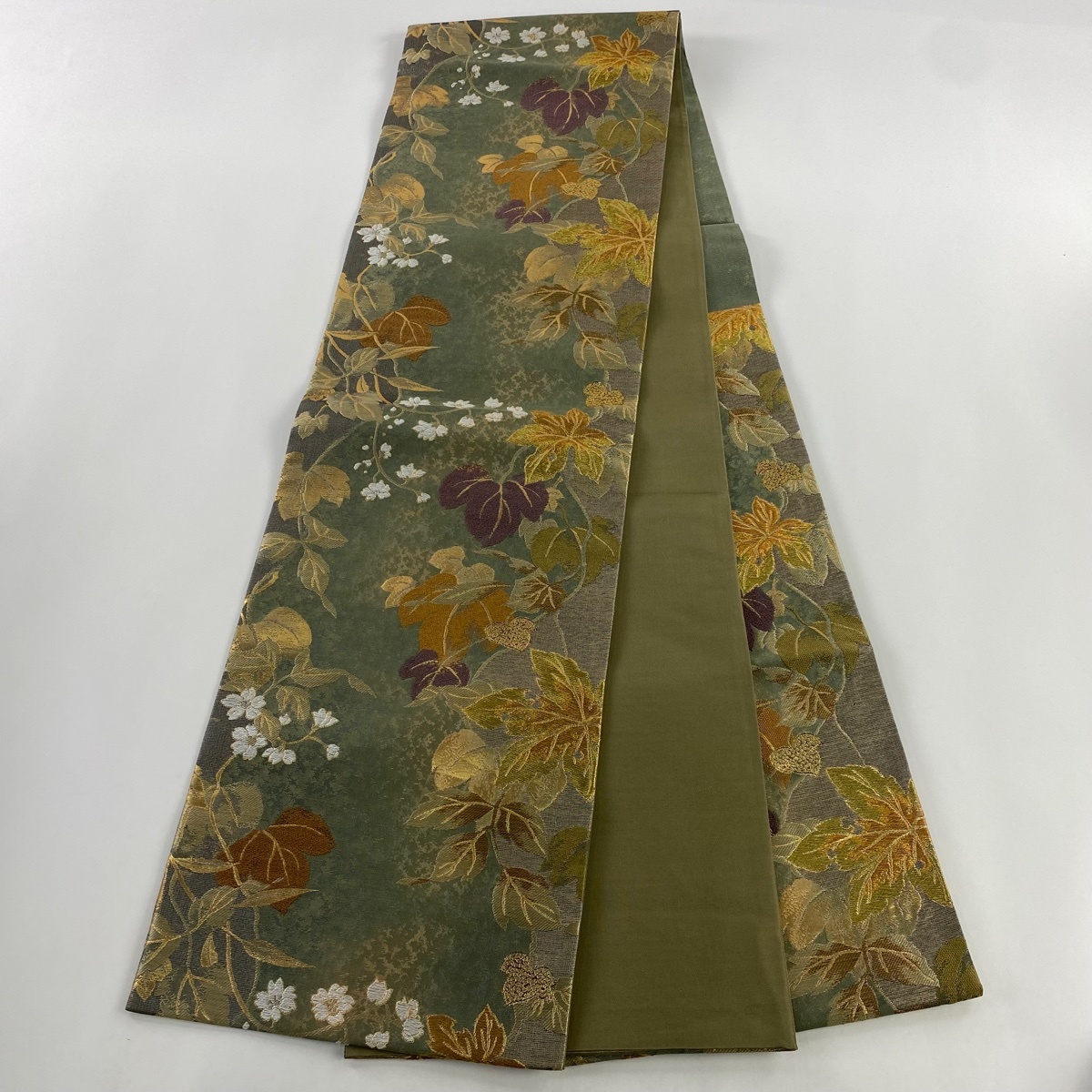 | 袋帯 美品 秀品 やまと 葉 花 金銀糸 箔 灰緑 六通 正絹 【中古】 |