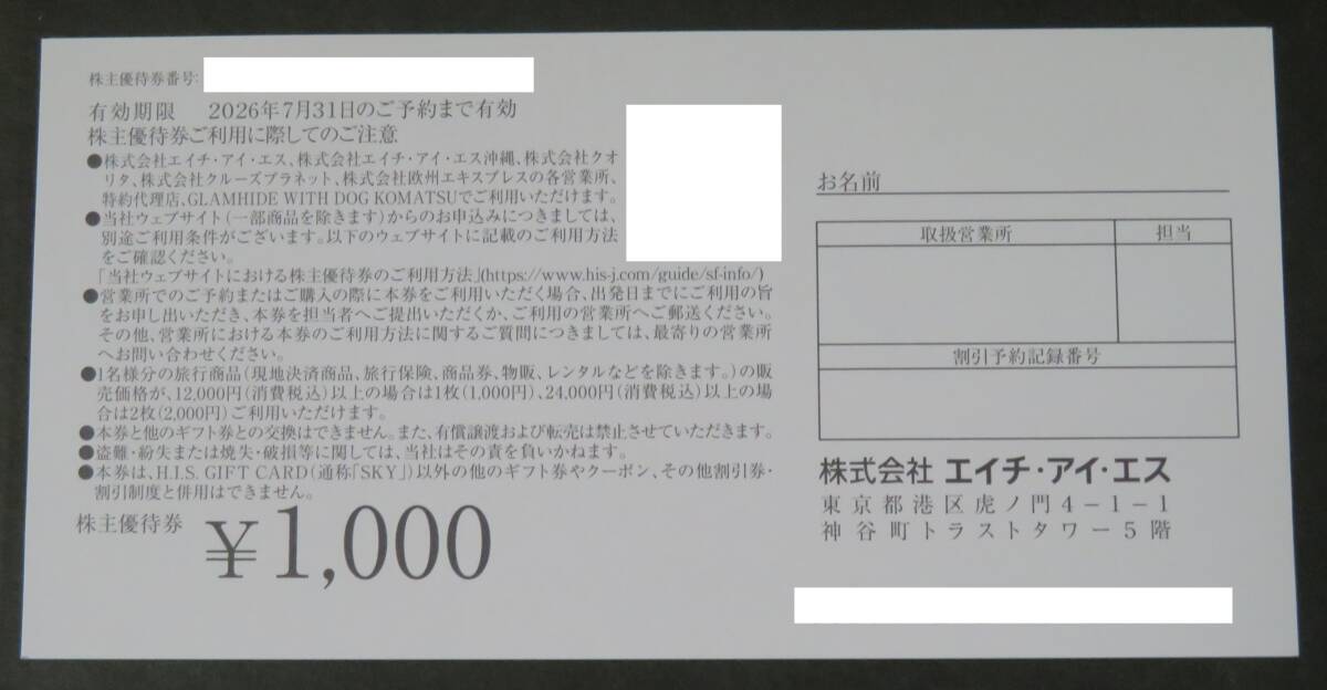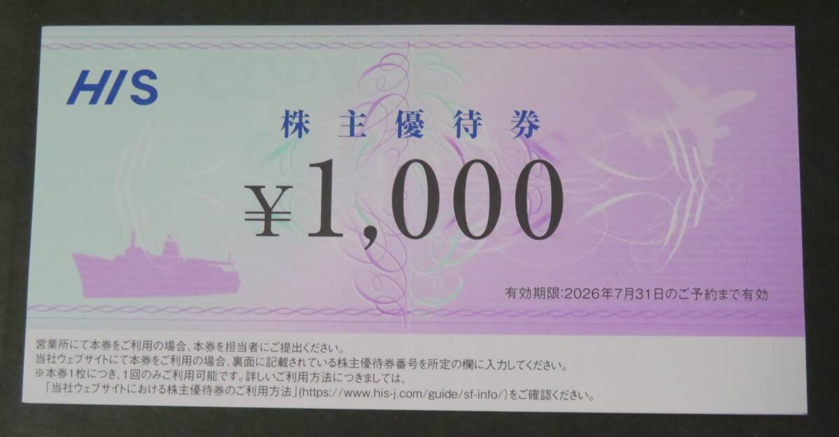 【株主優待券】HIS 株主優待券 1000円 〇有効期限:2026年7月31日まで