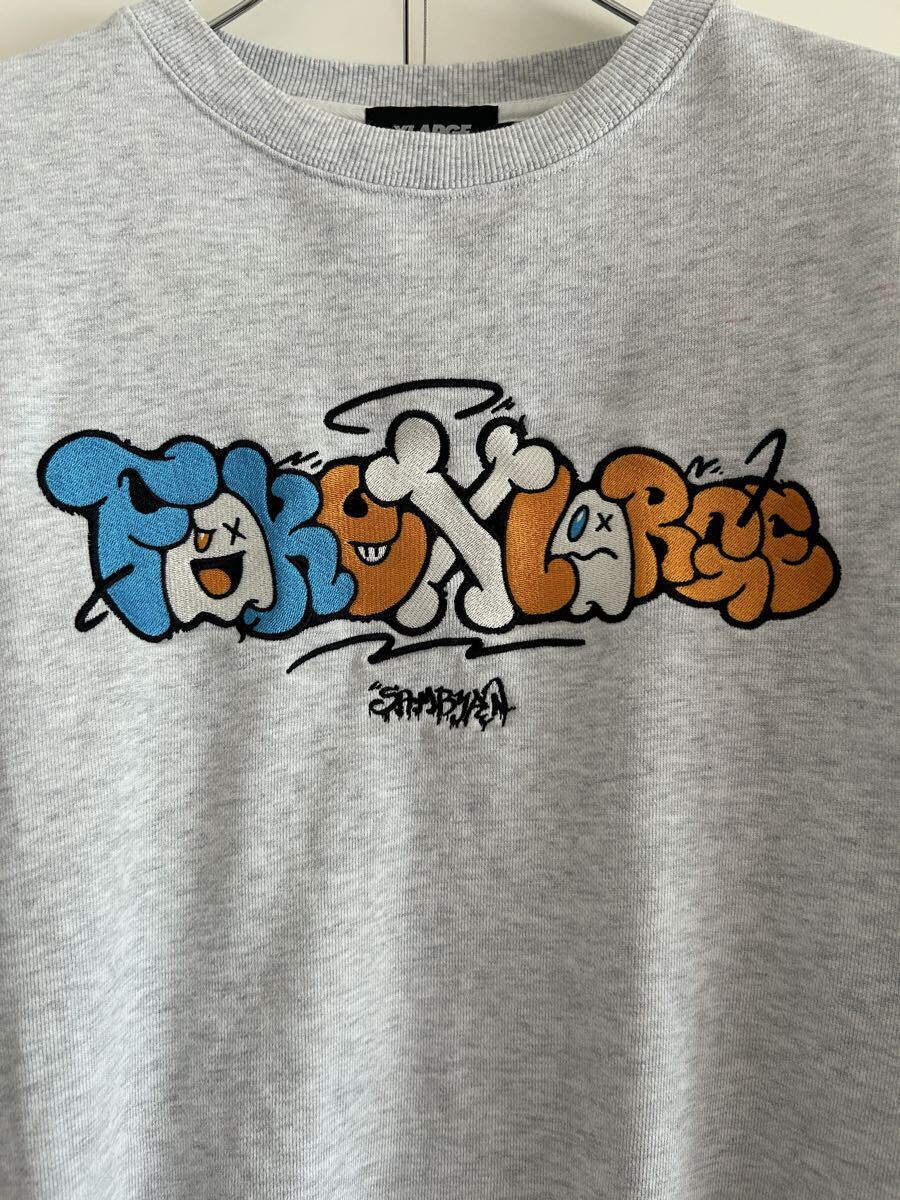 杢グレーのボディに、大胆なグラフィティロゴ刺繍を施した一枚。