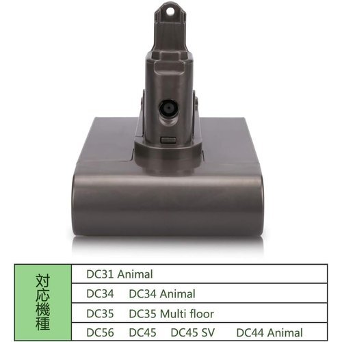 【バッテリー仕様】電圧:22.2v容量:3mAhセル:Li-ionリチウムイオン稼働時間:DC31DC34DC35では通常モードで約25~3分となり、強モードで約8~1分間の連続稼働が可能です。DC44DC45DC56は通常モードで約2~22分、強モードで約6~7分間となります。(環境によって使用時間が異なりご注意ください。)