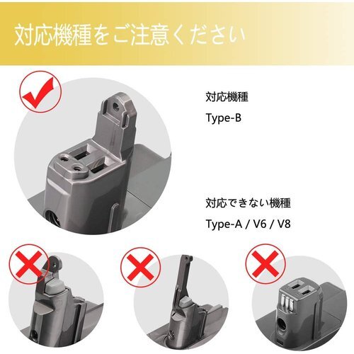 【タイプB対応機種】ダイソンバッテリーネジ固定TypeBのDC31DC34DC35DC44DC45DC56対応できます。兼用タイプ:91783-1、1783-2811、18172-1-4、1783-4211、1783-4ご購入前にバッテリーの形状をご確認下さい。DC35、DC45などのV2シリーズには、製造時期により2種類の形状が異なるバッテリーが使用されています。(ご注意:TypeAは対応できません。)