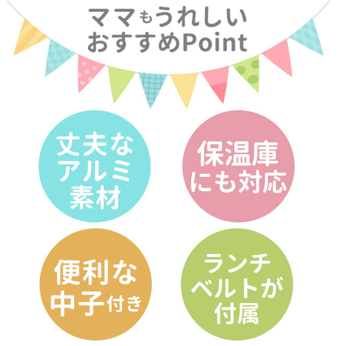| 注意点 | ※※[付属品]ランチベルト×1、名前シール×1 ※電子レンジ:不可 ※食洗機:不可 ※お取り扱いの際は、商品やパッケージなどに記載されている品質表示、アテンションタグ、ご使用上の注意事項などを必ずご確認下さい。 ※本来の目的以外にはご使用にならないで下さい。 ※カメラやモニターの性質により、画像と実物の色の違いがある場合がございますのでご理解願います。 |