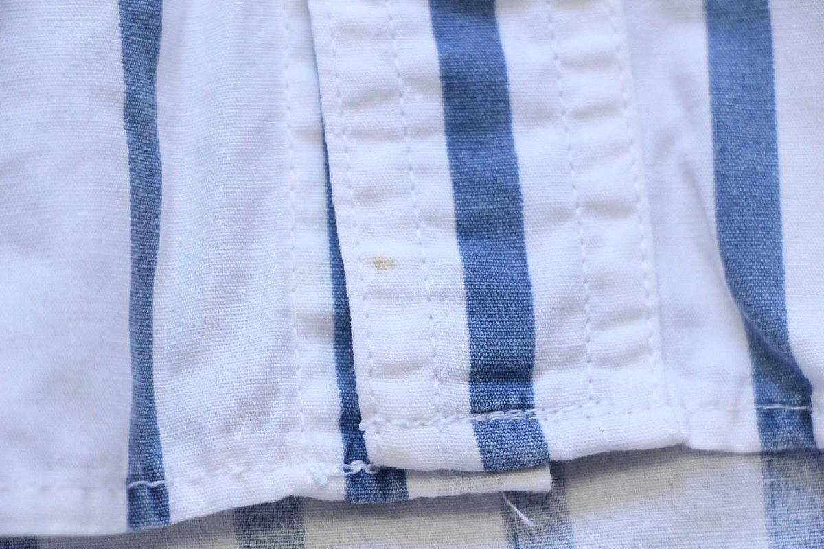 ダブルステッチ襟、縫製はダブルステッチ、左胸ポケットにフラップあり、胸ポケットは柄合わせされています。