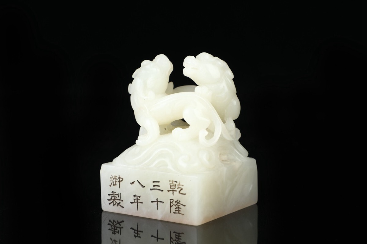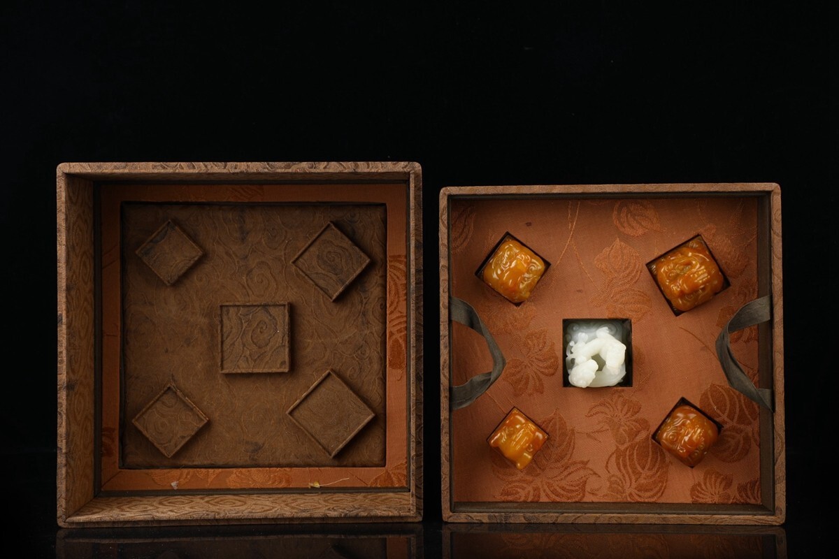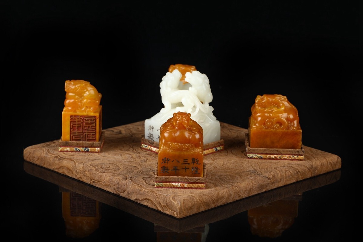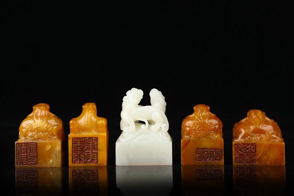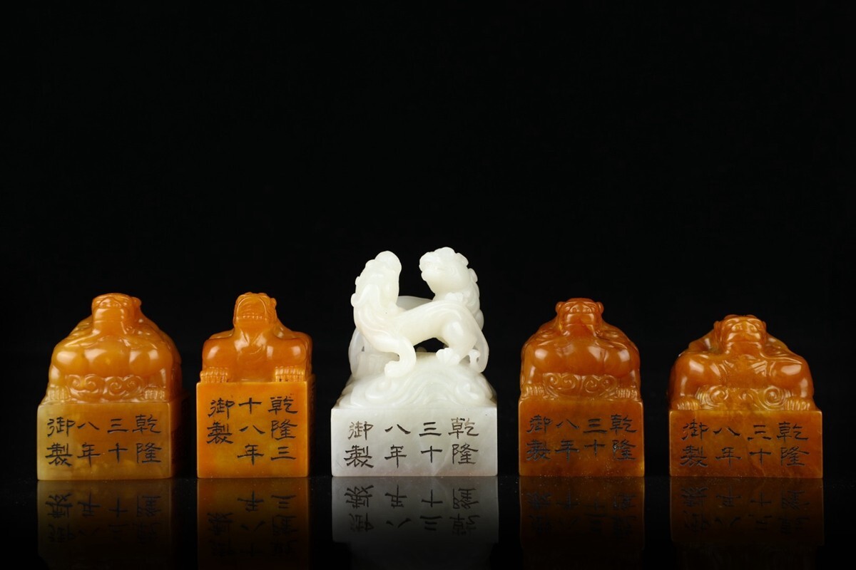 「清 乾隆三十八年御製 老寿山石 田黄石彫り 魑龍 古獣鈕套章 5枚」極細工 擺件 古賞物 中国古美術 旧蔵出