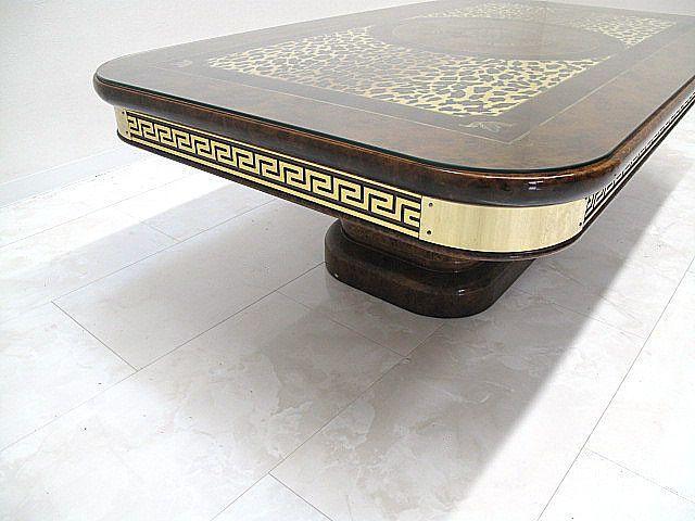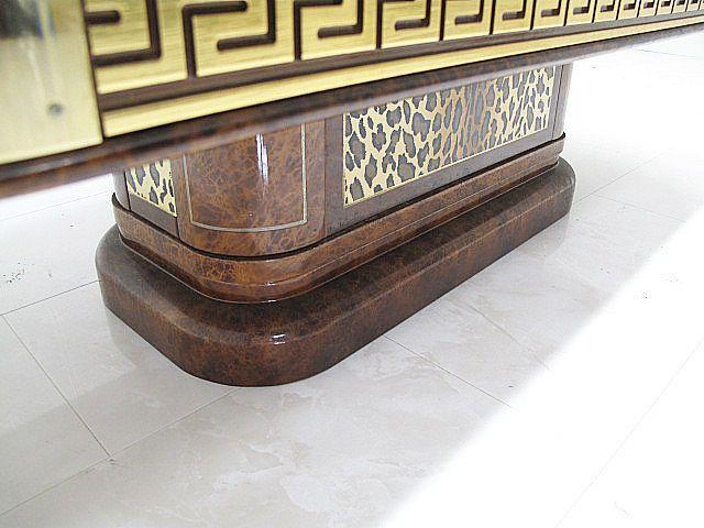 天板にはブランドの象徴であるグリークキーと繊細なレオパード柄が高精度にあしらわれ、中央には神話的モチーフが浮かび上がるように表現されています。細部に至るまで凝らされた意匠は、単なる家具の枠を超え、まるで室内の核となるアートピースのように空間を格上げします。