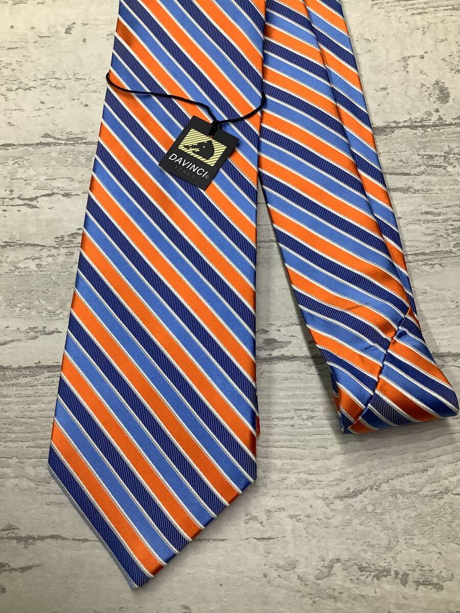 新品未使用★DAVINCI ダヴィンチ シルク100%ネクタイ サックスブルーベース、ブルー、オレンジのマルチ 逆ストライプ 少し長い目サイズ