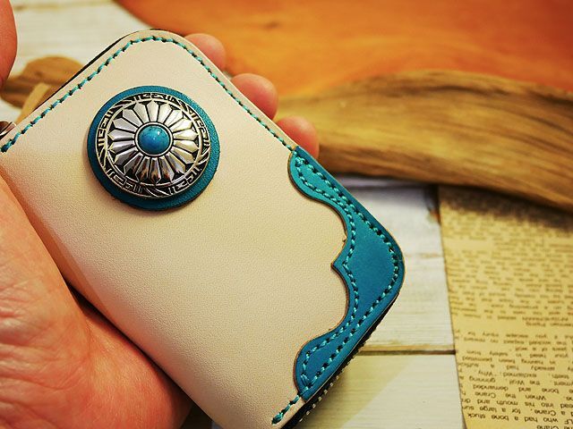 ラウンドファスナーミドルサイズ!! レザーコイン&カードケース ハンドメイド 姫路レザー 牛ヌメ タンロー×空ブルー