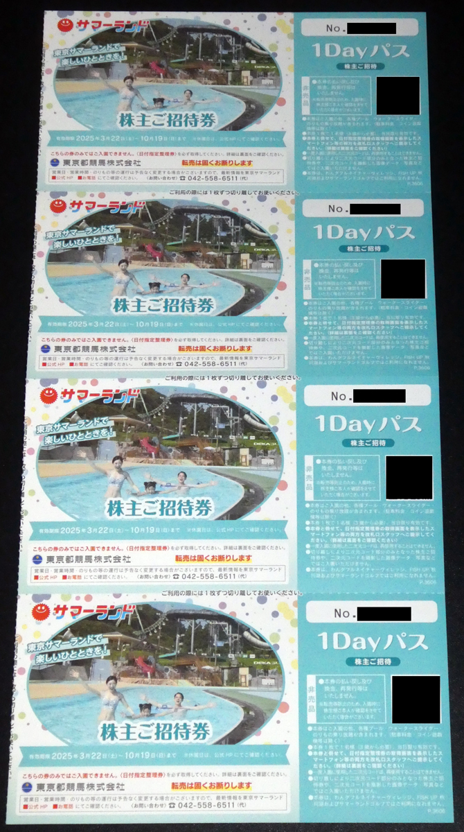 【匿名配送/追跡有】東京サマーランド 株主優待 招待券 1Dayパス 4枚 2025年10月19日まで