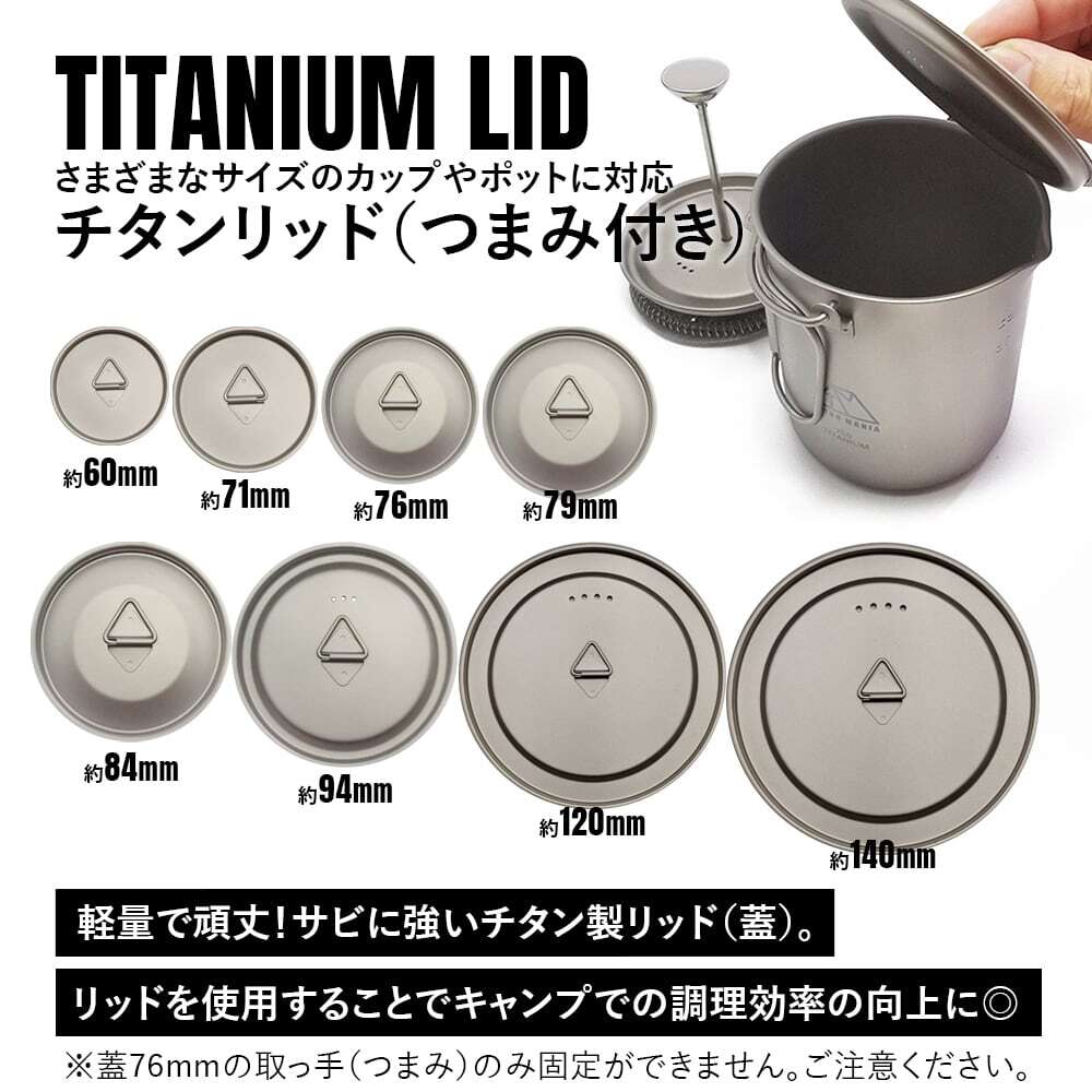 軽量で頑丈!サビに強いチタン製リッド(蓋)。当社製品をはじめ、さまざまなサイズのカップやポット、クッカーに対応可能。フタには便利なツマミ(取っ手)付き。 チタン蓋を使用することでキャンプでの調理効率の向上に。お湯を沸かしたり、料理をする時間の短縮にも。