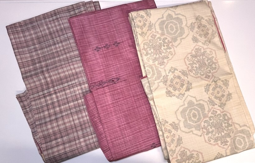 花とら●リサイクル着物 紬 3枚まとめて ピンク 格子 薄黄 リメイク 素材 細工用   250810