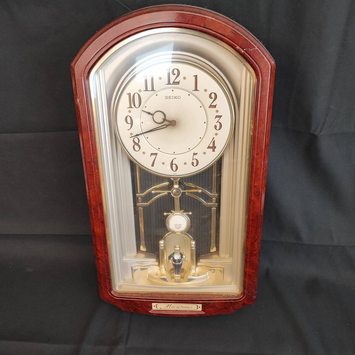 SEIKO マリオーヌ MariOnne RE526B は、日本製のからくり壁掛け時計で、毎時になると文字盤が降下し、指揮者の人形が現れて指揮棒を振るメロディ演出が楽しめるエレガントなインテリアアイテムです。クラシックなデザインの木目調フレームとゴールドカラーの装飾が調和し、独特の動きと音楽が住宅や店舗のアクセントに最適な逸品です。モデル名やイベントでの演出、ギフトにもおすすめです。