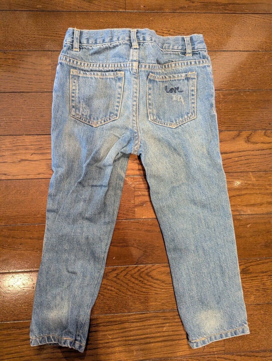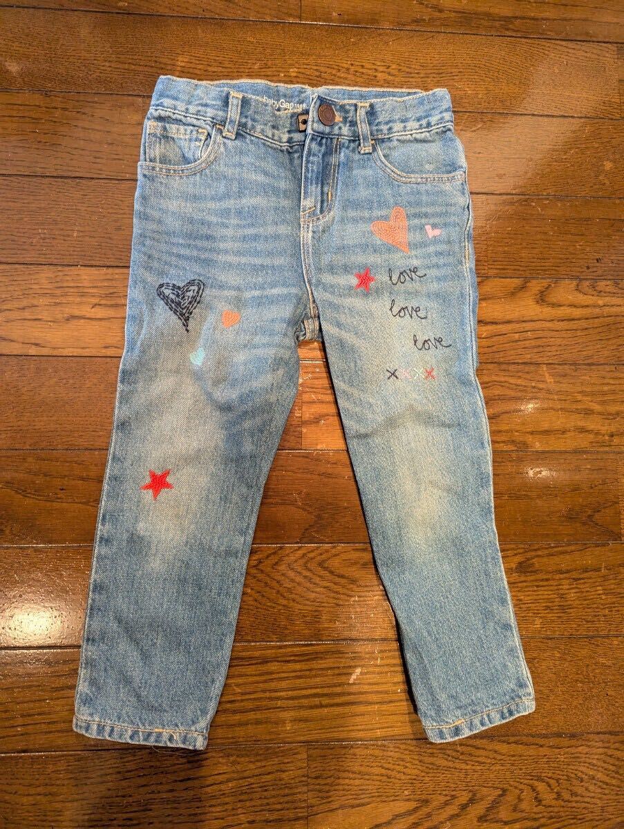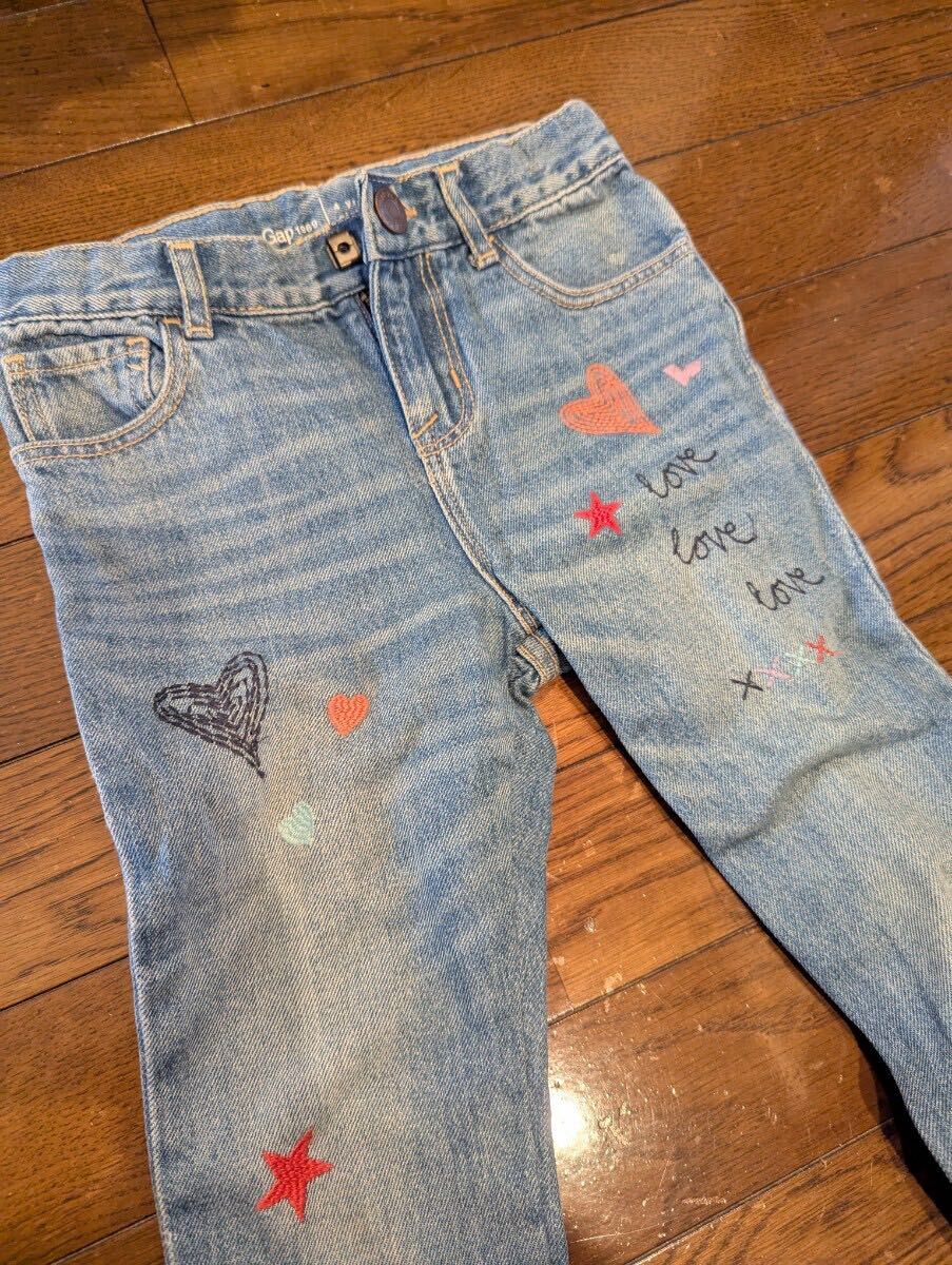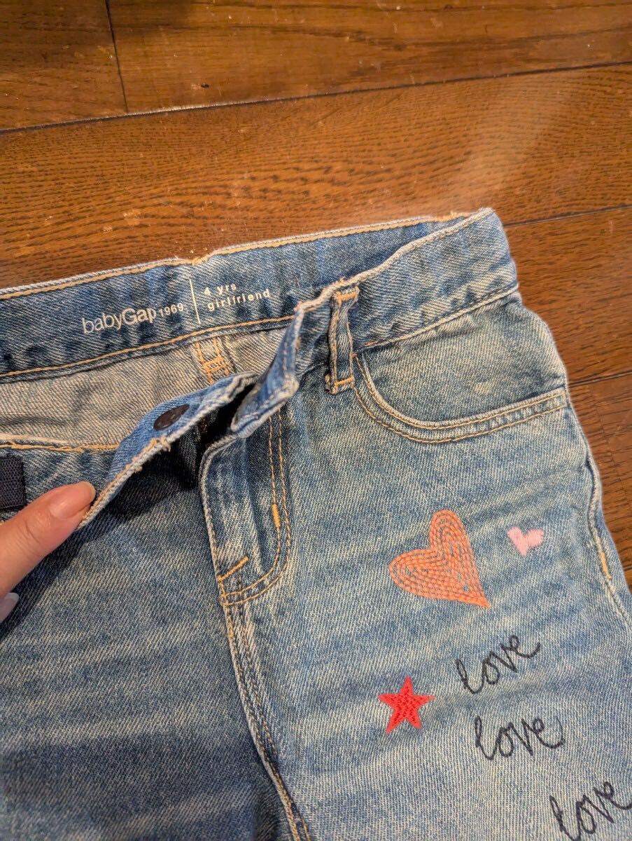 ハートの刺繍やユーズド加工がおしゃれなデニムです。シンプルなシャツに似合うと思います。
