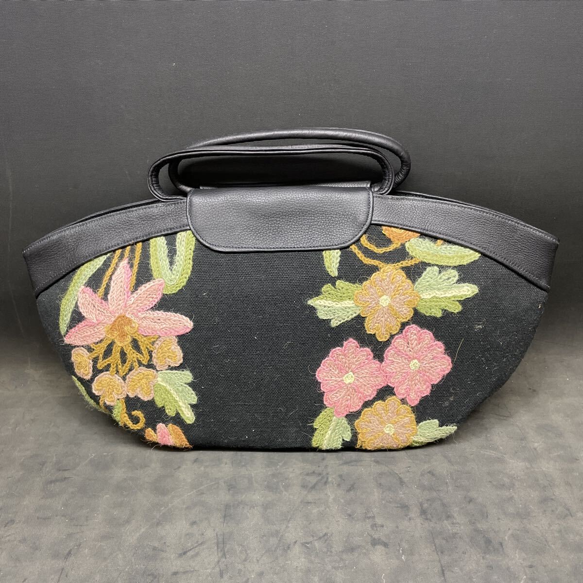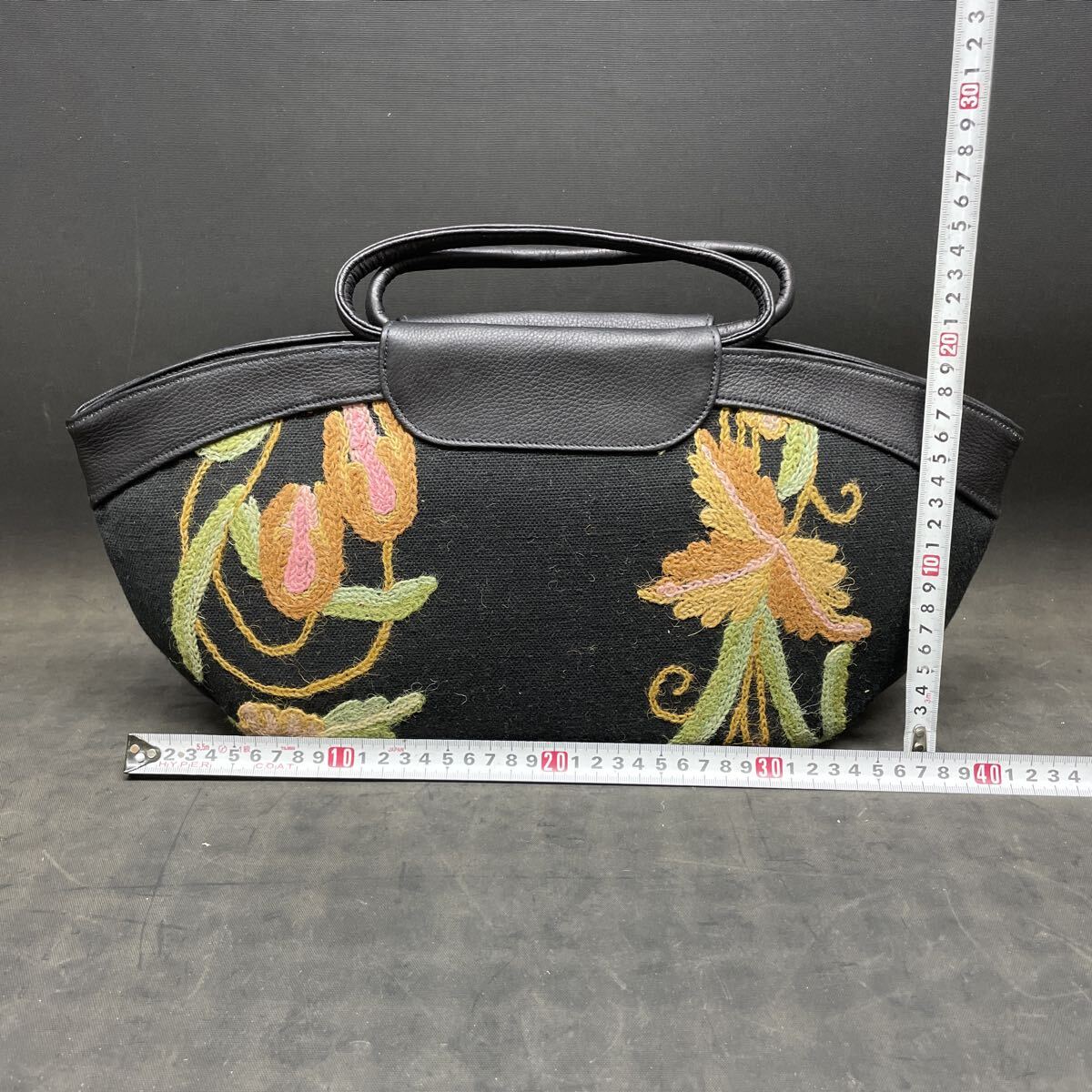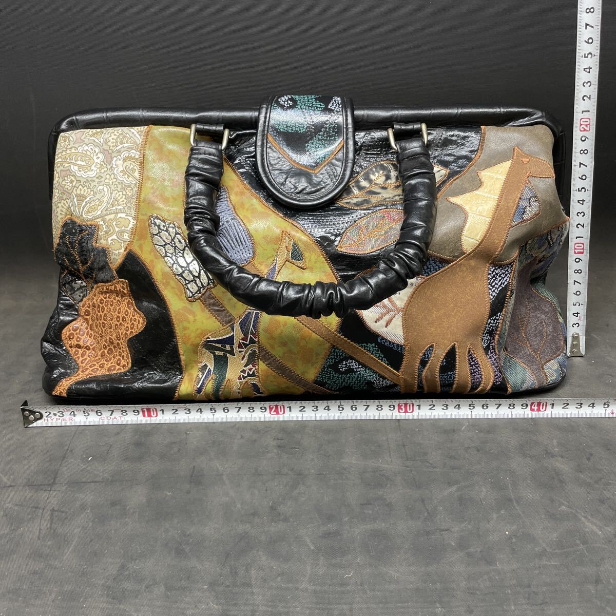 麻 刺繍 植物 パッチワーク キリン 素材不明 ハンドバッグ 保管品 現状品