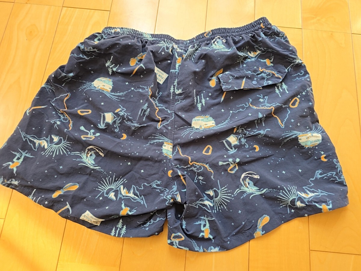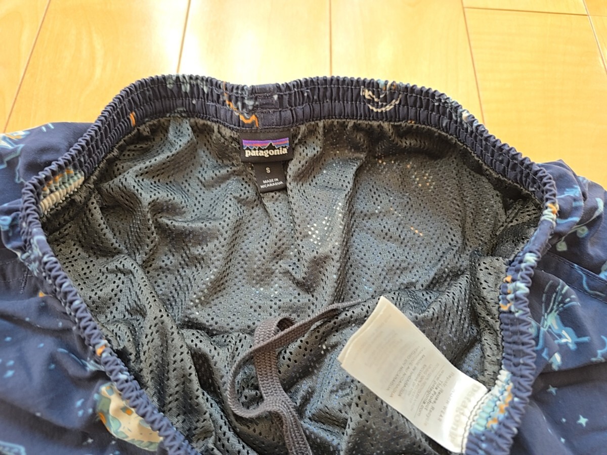 海洋テーマのプリントが特徴のPatagoniaショートパンツ、メッシュライニングとサイドポケット付きで快適な着用感。