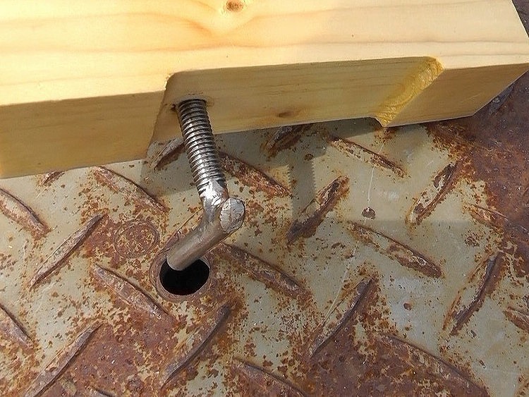あいあんくらふと 桟橋アンカー 鉄板桟橋専用です。鉄板桟橋の縞鋼板に開いている吊下げ用の穴を利用してパラソル用の横木を固定します。鉄板穴14φで使用可能です。使用法は動画のリンクを載せておきますので確認してください。もちろん通常のパラソル万力を固定することも可能です。別に出品している「桟橋アンカー用アルミパーツ」を組み合わせると様々な固定法ができるようになります。