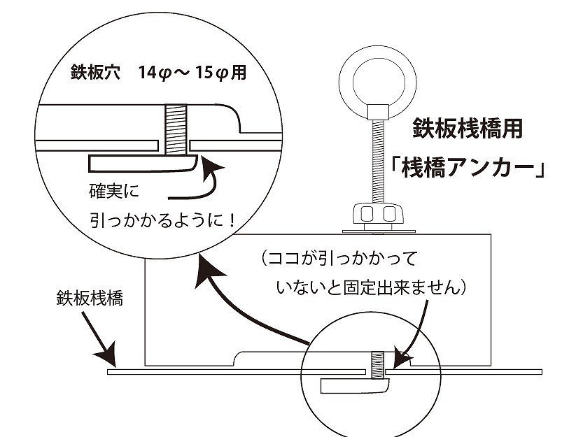 ・鉄板桟橋専用/鉄板(縞鋼板)製の桟橋で移動時にワイヤーを掛ける14~15mmの穴を利用して建てるタイプ。<強度5>