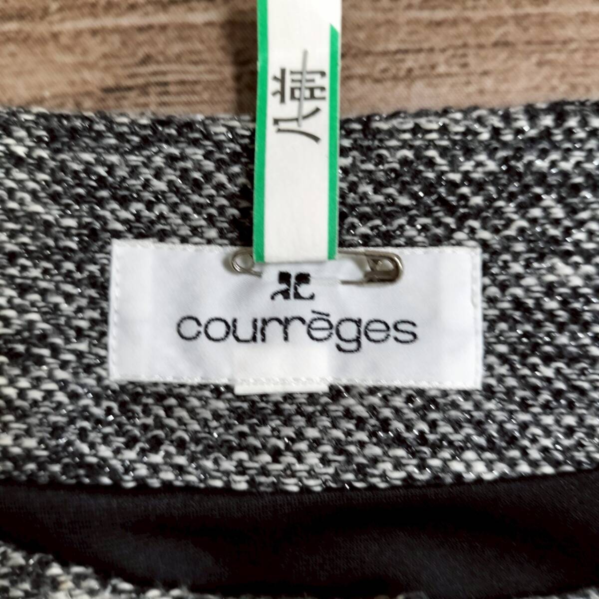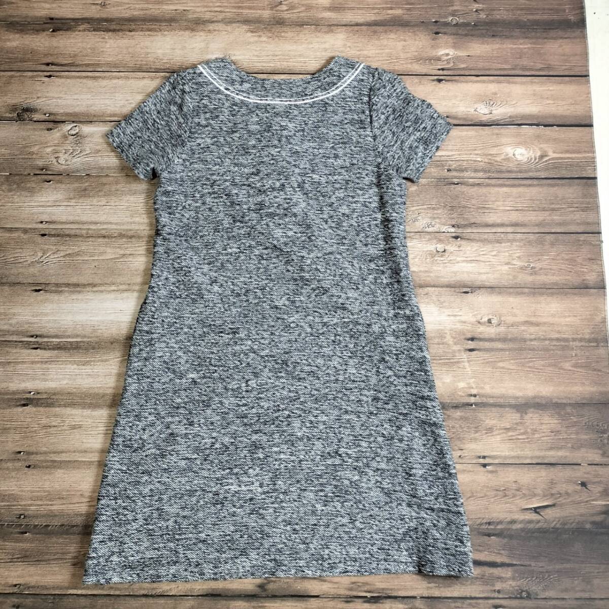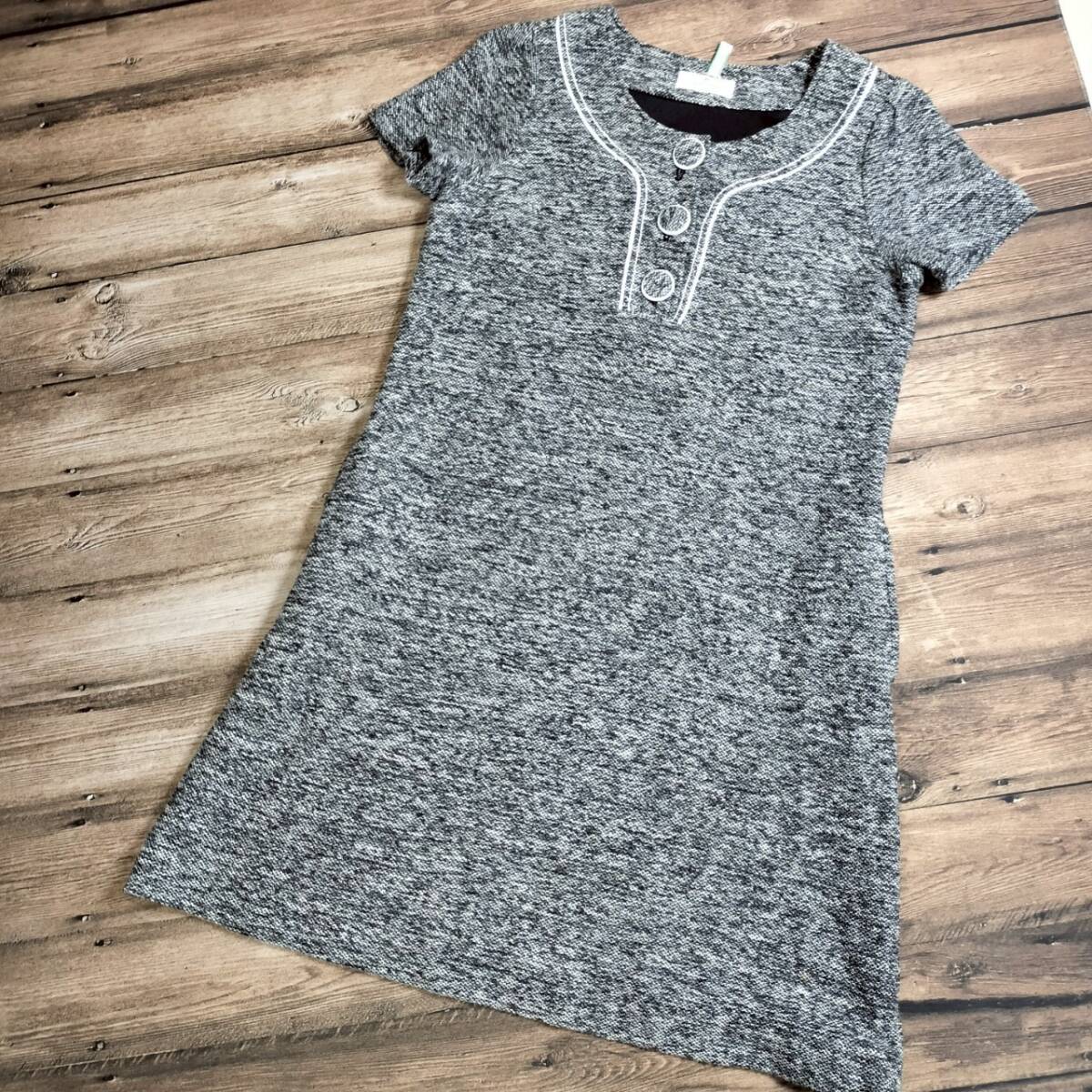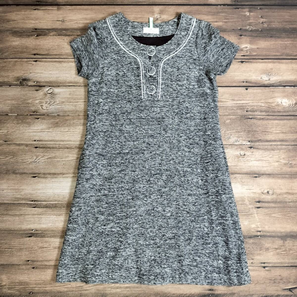 上品な杢調 Courrges クレージュ レディース 半袖 膝丈ワンピース チャコールグレー ホワイト ミックス柄 日本製 サイズ38 Mサイズ 細見え