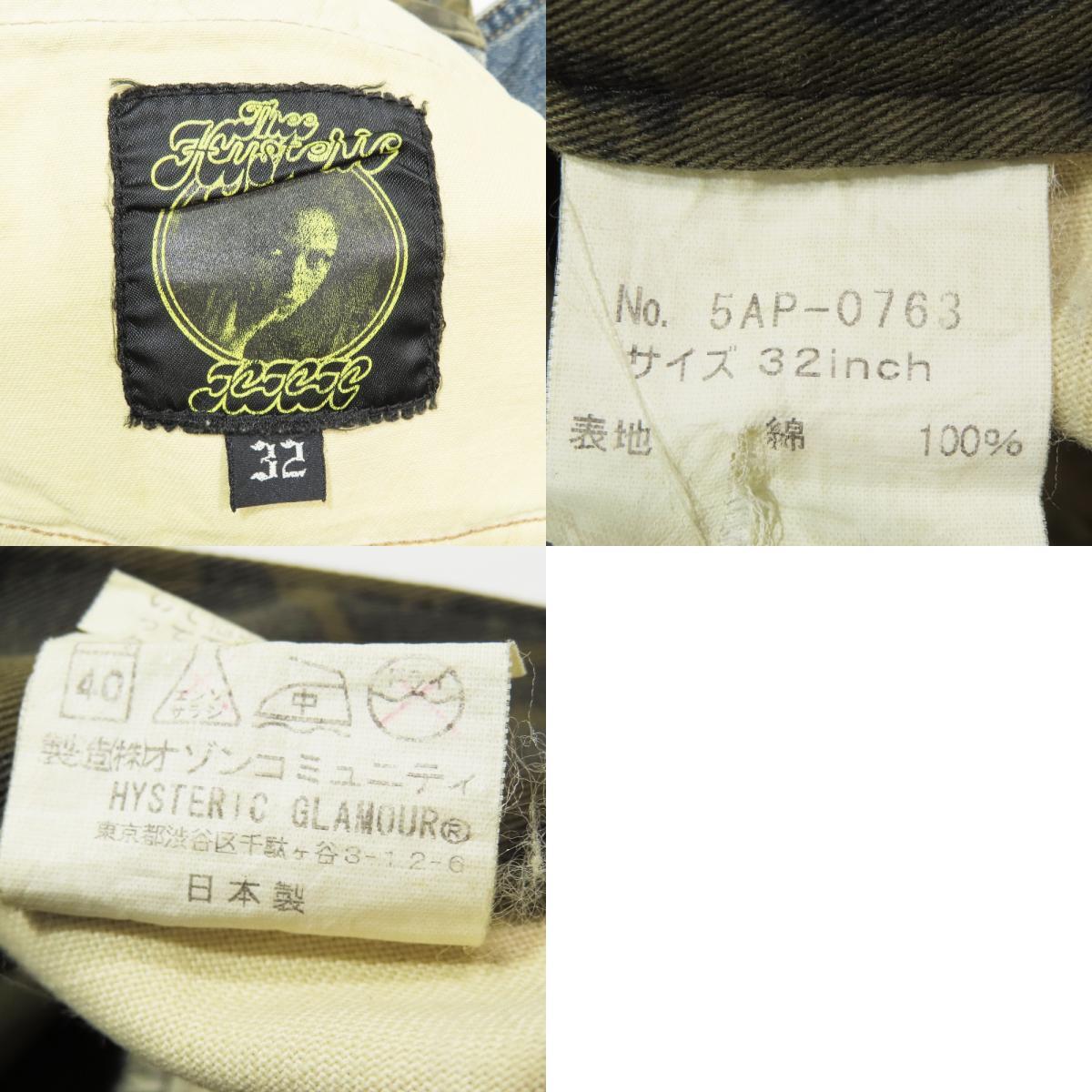 美品 HYSTERIC GLAMOUR ダメージ加工 コンビネーションデニム ジーンズ レオパード ボタンフライ 5AP-0763 ボトムス インディゴ 32