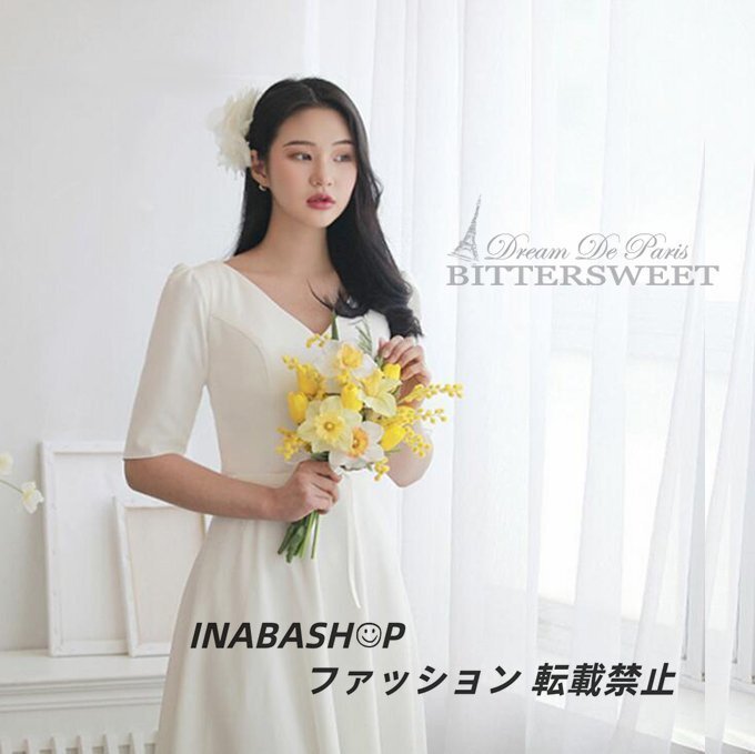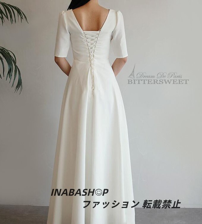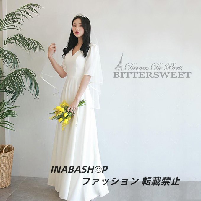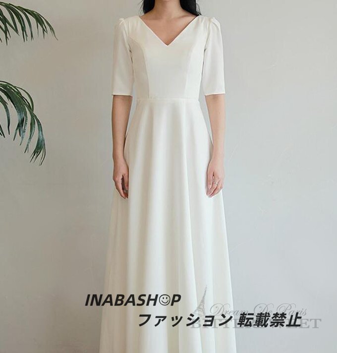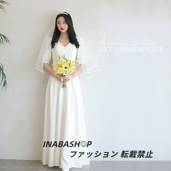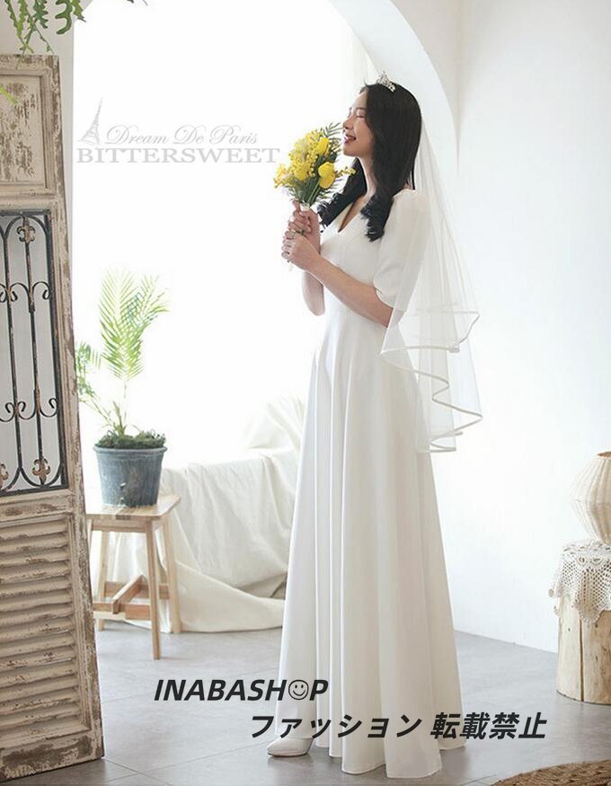 ウェディングドレス ワンピースウェディングドレス 半袖 Vネック ウエディングドレス ドレススレンダーラインロング 結婚式 海外挙式ドレス